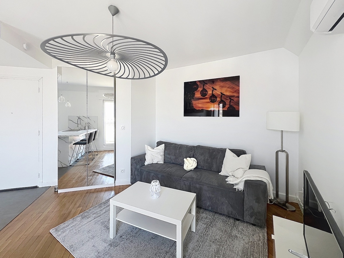 Tinatanggap ka ng maluwang na 43m2 T2 na ito na ganap na na - renovate noong 2024 para sa komportableng pamamalagi sa gitna ng magandang distrito ng hyper center ng Grenoble. Binubuo ito ng isang silid - tulugan, sofa bed, banyo, hiwalay na toilet, bukas na planong pamumuhay / kusina at 2 balkonahe. Matatagpuan sa ika -9 at tuktok na palapag na may elevator, nag - aalok ito ng terrace na 30 m2 na may malawak na tanawin ng Vercors at Bastille.