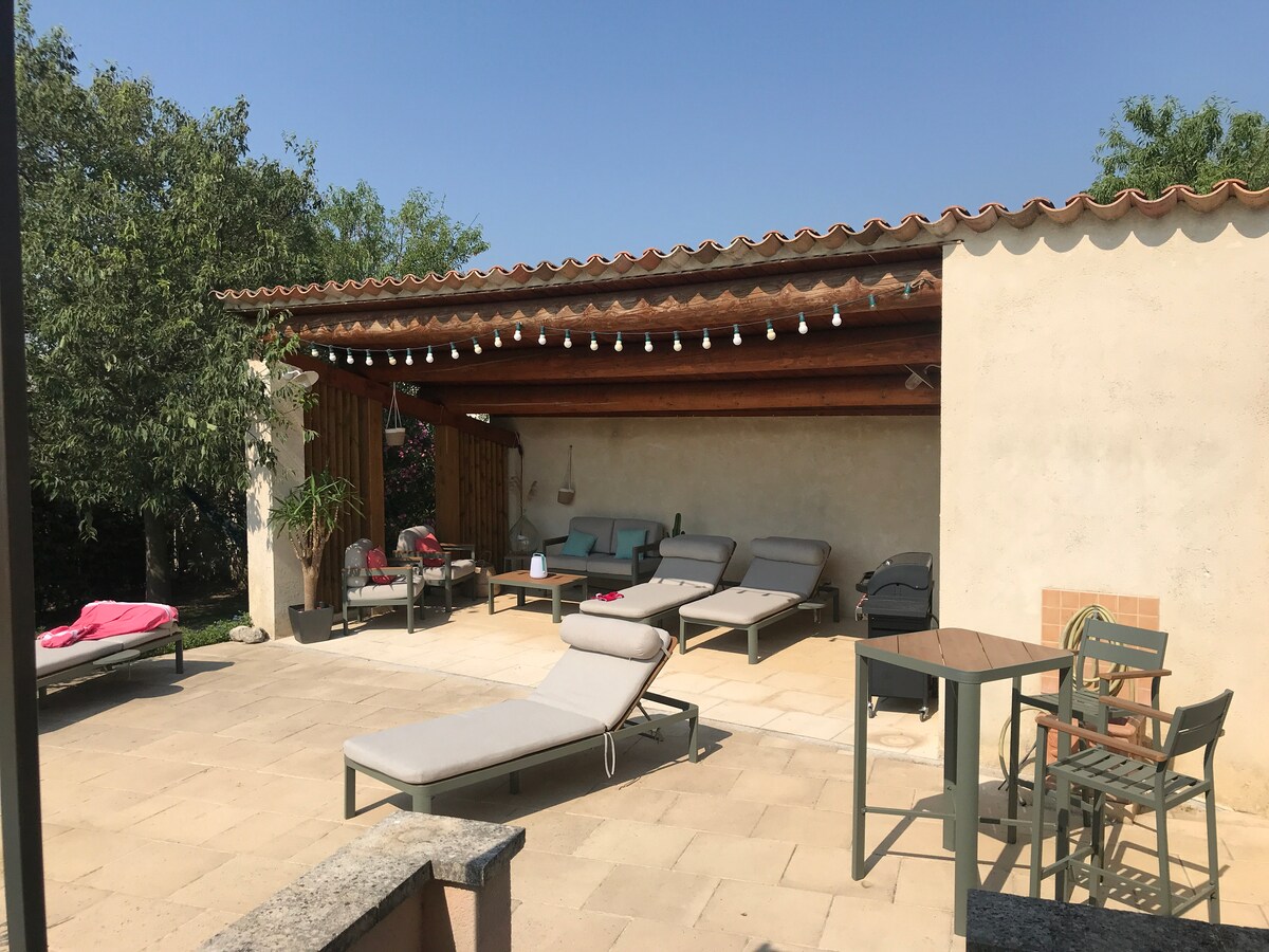 Maayos na inayos na bahay na may maginhawang alindog. Bamboo garden na may barbecue, plancha, outdoor lounge, fire pit, buong taong jacuzzi at sauna para sa dalawang tao para sa mga nakakarelaks na sandali. Maganda ang lokasyon ng bahay na may tanawin ng Palais des Papes at Pont d'Avignon sa tahimik na lugar na 8 minutong lakad lang mula sa makasaysayang sentro. Magandang paglalakbay ang naghihintay sa iyo sa isla o sa lungsod. May mga bisikleta, raket, at set ng pétanque.