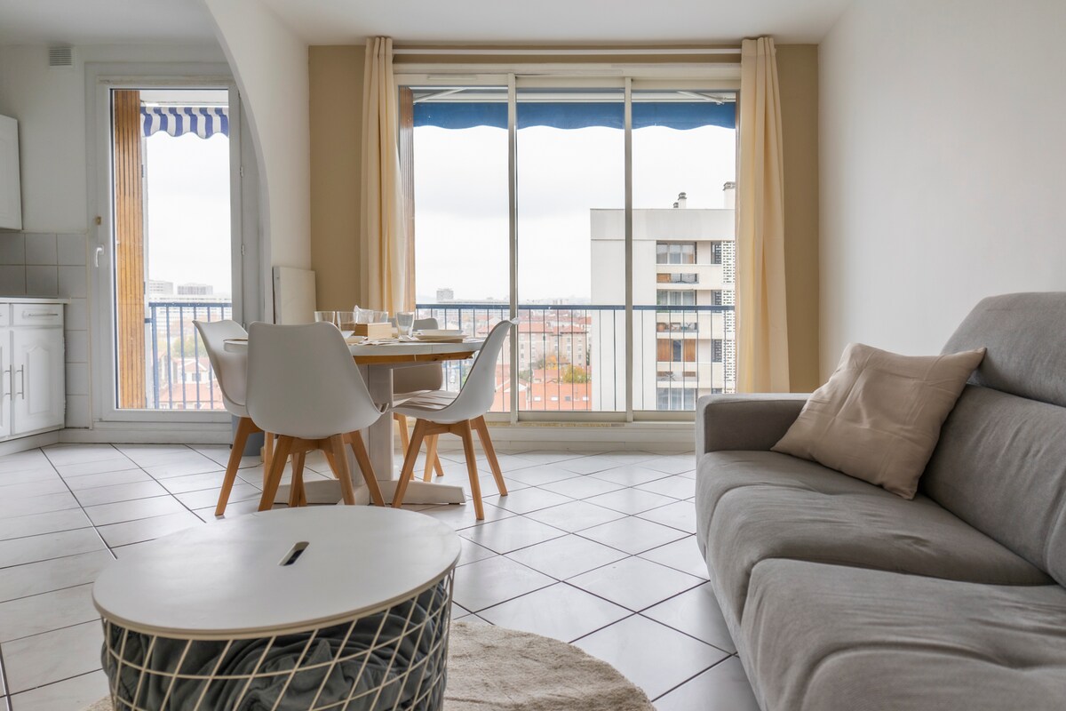 Nag - aalok kami ng aming apartment sa gitna ng Le Gratte Ciel sa isang tahimik na kalye at isang sikat na tirahan. Mayroon itong maliit na paradahan sa basement at malaking wooded park sa likod ng gusali. Maginhawang matatagpuan ito dahil 450 metro ang layo ng Gratte - Ciel metro at 200 metro ang layo ng mga tindahan. Matatagpuan sa ika -10 palapag, nag - aalok ang terrace ng mga kahanga - hangang tanawin ng Gratte Ciel at Lyon.