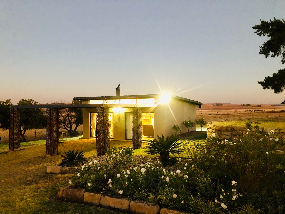 Isang magandang bakasyunan papunta sa kanayunan, 80km lang mula sa Johannesburg sa isang tarred road. Ang cottage na ito, malapit sa pangunahing farmhouse, ay matatagpuan sa isang hiwalay na bakod na hardin. May de - kuryenteng bakod sa paligid ng hangganan ng property at remote control gate. Ang isang silid - tulugan ay may king sized bed. Ang ikalawang silid - tulugan ay may dalawang single bed. Isang banyo. Ang access sa tuluyan ay sa pamamagitan ng pribadong pinto sa harap. Maliit na kusina, na may bar refrigerator, microwave, toaster at maliit na kalan at oven.