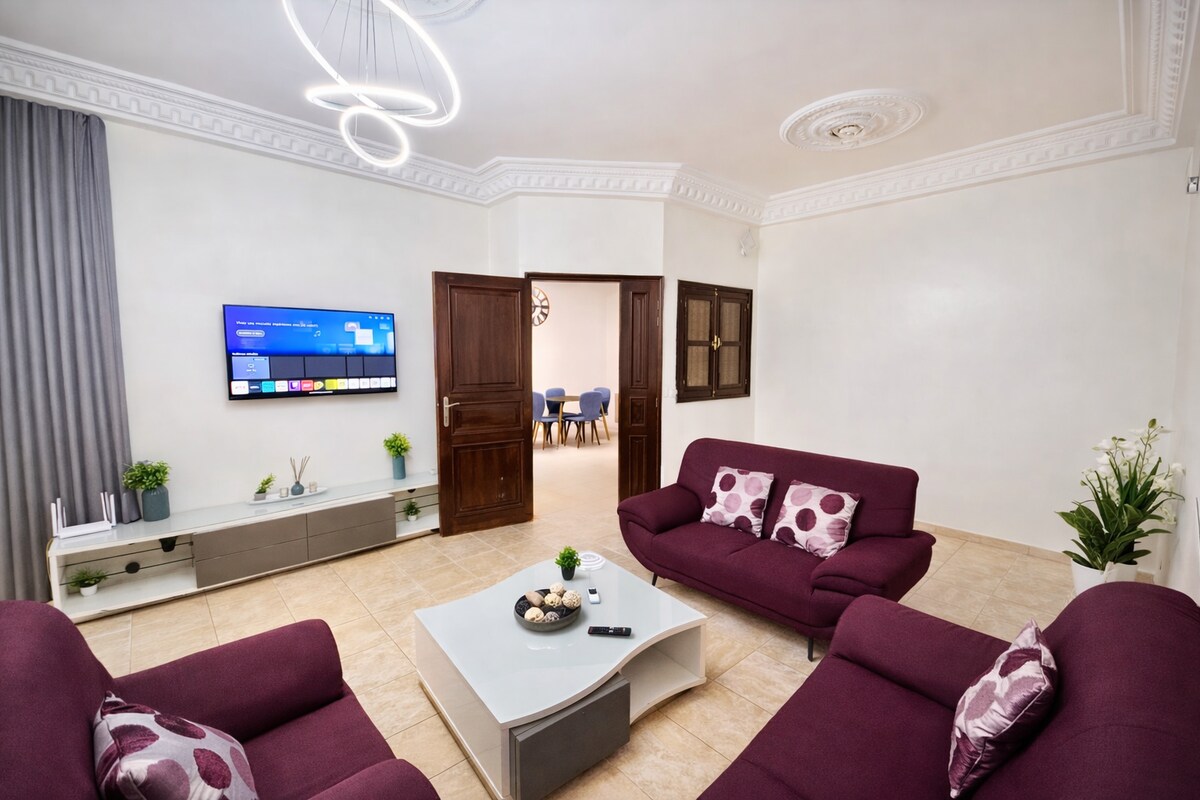 Kaaya - ayang 3 kuwarto (1 mararangyang silid - tulugan, 1 eleganteng silid - tulugan sa Africa at 1 chic na kontemporaryong sala) na 120 m2 na kumpleto sa kagamitan sa ika -1 palapag ng kaakit - akit na gusali. Matatagpuan ito sa gitna ng extension ng kalayaan 6, malapit sa VDN at lahat ng iniaalok ng Dakar: downtown, mga tindahan at libangan. Nag - aalok ito ng lahat ng amenidad: kusina na may kagamitan, air conditioning para sa lahat ng kuwarto, 2 banyo (isa para sa mararangyang kuwarto at isa para sa mga bisita), mainit na tubig, washing machine.