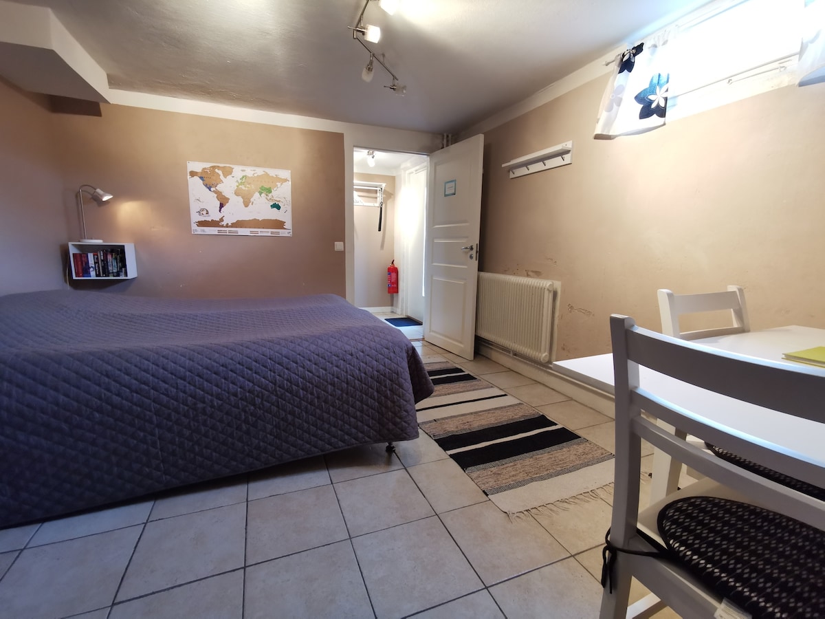 Isang maginhawang apartment sa isang residential building sa isang tahimik na lugar sa Visby na may kasamang libreng paradahan sa labas ng entrance. Ang apartment ay may 1 kuwarto, maliit na kusina at pribadong banyo na may shower at toilet. Mayroon kaming malaking hardin na maaari mong gamitin kung nais mo. May iba't ibang patio kung saan maaari kayong magsimula ng magandang araw sa pamamagitan ng pagkakaroon ng almusal sa ilalim ng araw, pagkakaroon ng barbecue sa gabi o magrelaks lamang. May 2 bisikleta sa bahay.