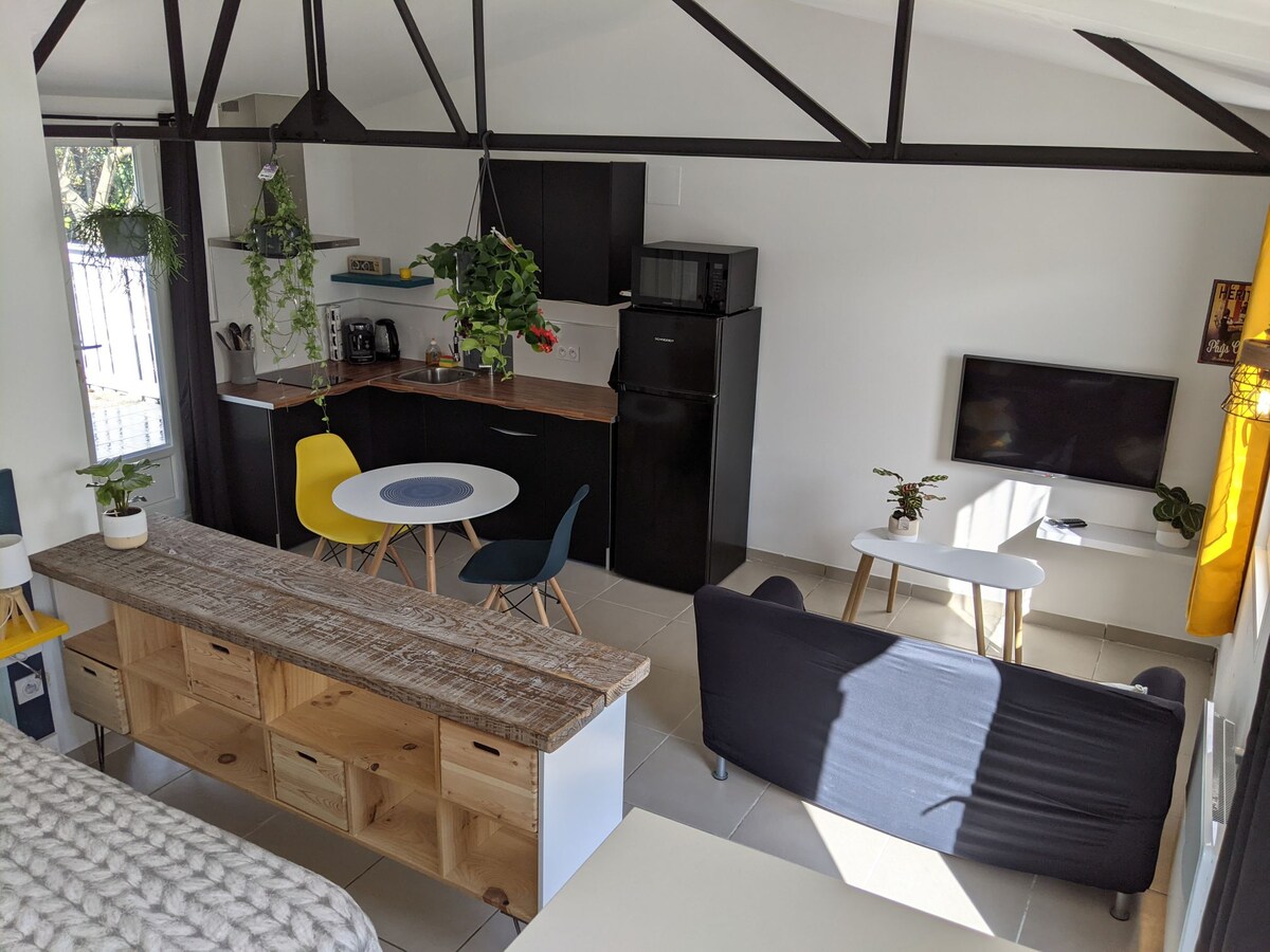 Umupa ng maliit na hiwalay na uri ng bahay na T2 sa Tordères na matatagpuan sa pagitan ng dagat at bundok na may mga tanawin ng Canigou mga 30 minuto mula sa Perpignan at Spain (hangganan ng Espanya). Kaaya - ayang lugar para sa mga pista opisyal para sa mga pamilya o sa mga kaibigan. Malapit ang 47 m2 na bahay sa kagubatan ng Réart (hiking trail at Eucalyptus). Binubuo ito sa loob: sala/silid - kainan (sofa bed), kusinang kumpleto sa kagamitan, silid - tulugan na may shower. Terrace na may grill at pool (pinaghahatian)