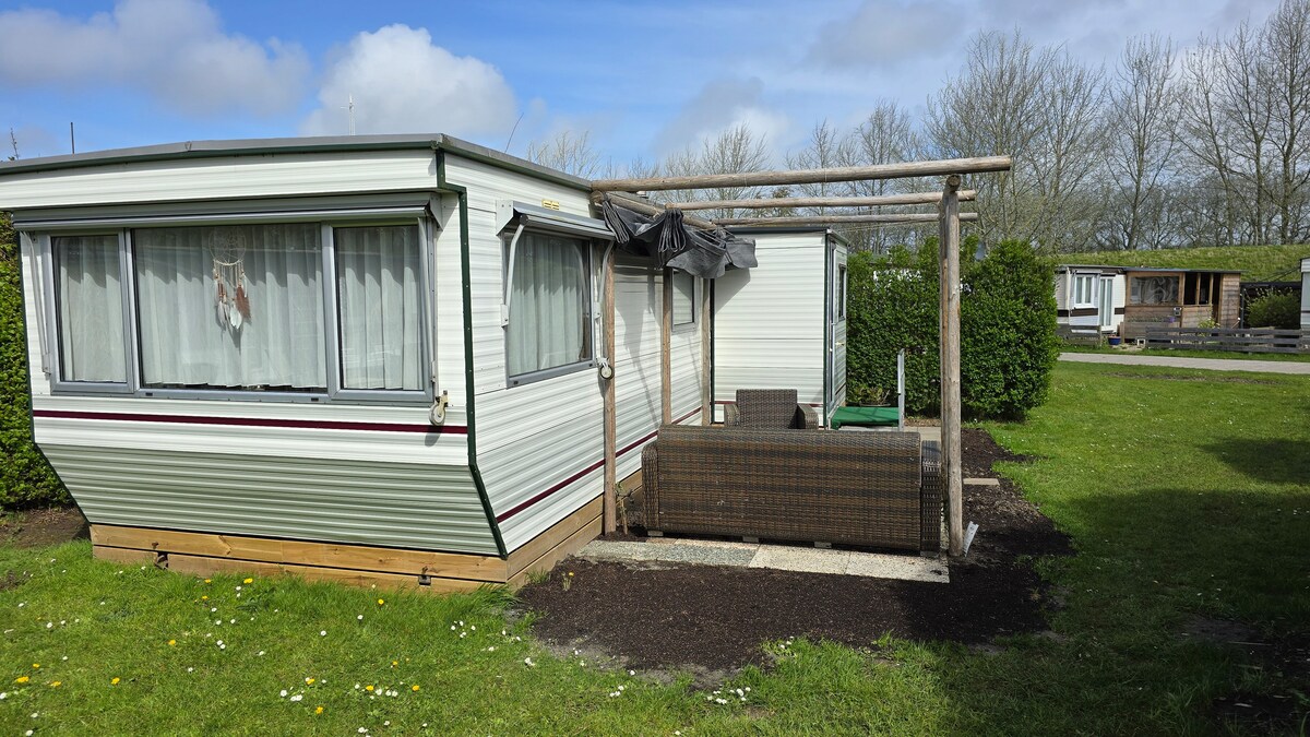 Ipinapagamit: Mobile home sa maliit na campsite ng pamilya malapit sa mga reserbang kalikasan at mga 1.5 km mula sa beach. HINDI PINAPAHINTULUTAN ANG PAMAMALAGI NA MAY KAUGNAYAN SA TRABAHO AT AALISIN ITO NG ADMIN. Layout: Clog loft Living room with dinette. (dining table/double bed) Kusina na may mainit na tubig, kalan ng gas, coffee machine, kettle at oven. Double bed na silid - tulugan. Palikuran. Sa isang shower building na halos 50 metro ang layo, libreng showering 4 p. caravan. 2 sa kuwarto at 2 sa dinette. Linen at mga tuwalya sa higaan