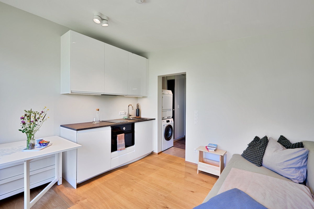 Wohnen im Grünen. Genieße die Klänge der Natur. Hier sagen sich Fuchs und Reh gute Nacht. Mit etwas Glück kannst du die beiden beobachten. Starte dein Tag mit Yoga und Blicke dabei ins Tal. Sport in and out. - Wanderwegenetz 0min - Schigebiet (3min mit dem Auto) - Loipe (10 min zu Fuss) - Einkaufsmöglichkeiten (3min Nahversorger bis 15min Einkaufszentrum) Komplett ausgestattetes 1-Zimmer Studio mit Platz für eine, maximal 2 Personen. Grenzt an Hus154 (separate Eingänge). - Ausziehbares Bett