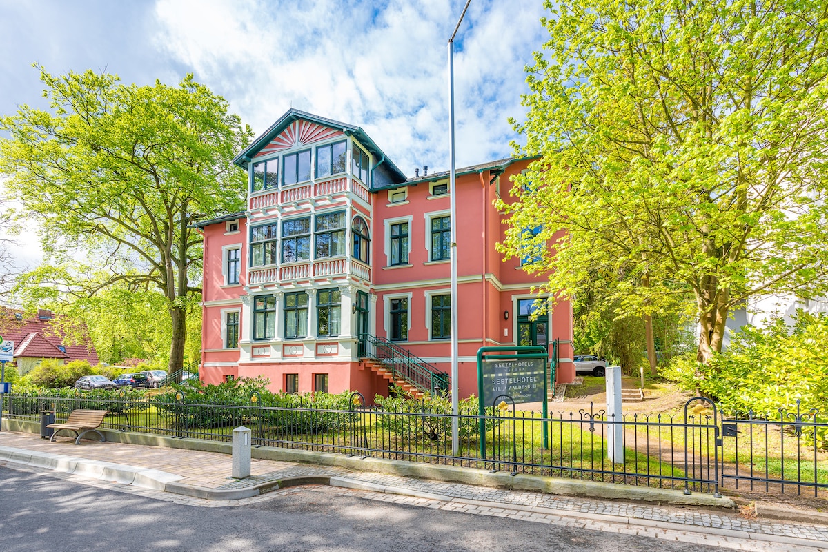 Limang minutong lakad lang mula sa magandang beach sa Baltic Sea, tinatanggap ka ng maayos na itinayong muli na Villa Waldesruh—isang tunay na kagandahan ng Art Nouveau sa gitna ng Heringsdorf. Dito, mamumuhay ka nang tahimik at kaakit-akit sa gitna ng karaniwang arkitektura ng spa ng imperyal na panahon. Ilang minuto lang ang layo ang makasaysayang sentro ng baryo sa tabi ng magandang promenade sa beach—perpekto para sa paglalakad habang pinakikinggan ang alon ng dagat.
