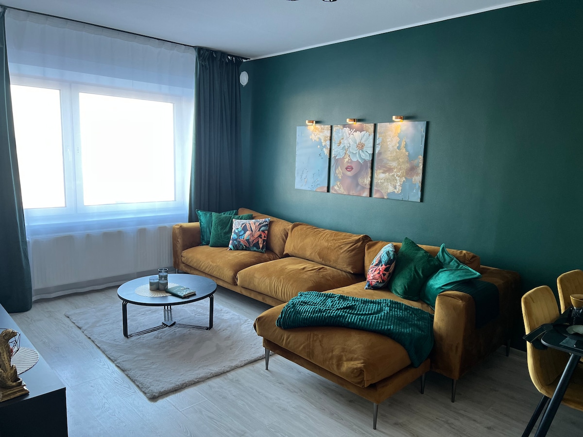 Bagong naka - istilong apartment na may isang silid - tulugan na 15 minutong biyahe mula sa sentro ng lungsod. Maluwag ang apartment at may malaking balkonahe na may magandang kape sa umaga. Nasa apartment ang lahat ng kailangan mo para maramdaman mong komportable ka at maging maganda ang pakiramdam mo. Posible na maglaba, magluto, at mag - enjoy sa mabilis na internet.