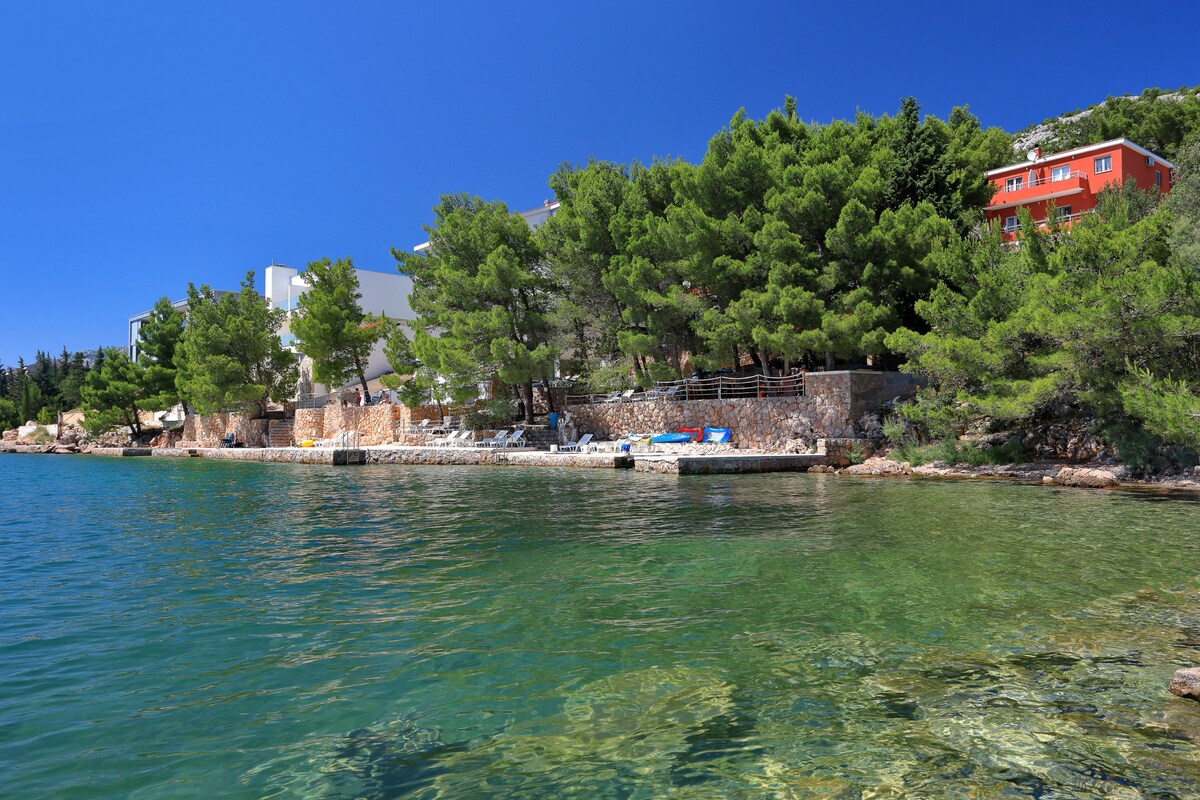 Ang Royal ay bago, moderno at marangyang inayos na apartment na may jacuzzi, 50 metro ang layo mula sa beach. May 50 metro kuwadrado at 30 metro kuwadrado na terrace. May kasamang 2 silid - tulugan, isang sala, isang ganap na eqipped na kusina na may dining area, banyo na may great shower, mga pasilidad ng barbecue, garahe(1 kotse), flat - screen TV sa bawat kuwarto at libreng wi - fi. Nag - aalok ng malaking terrace na may bukas na tanawin ng dagat sa mga nakapaligid na isla. Maaaring tangkilikin ang pagsisid sa malapit. 5 km ang layo ng Trogir at 8 km ang layo ng Split airport mula sa acommodation.