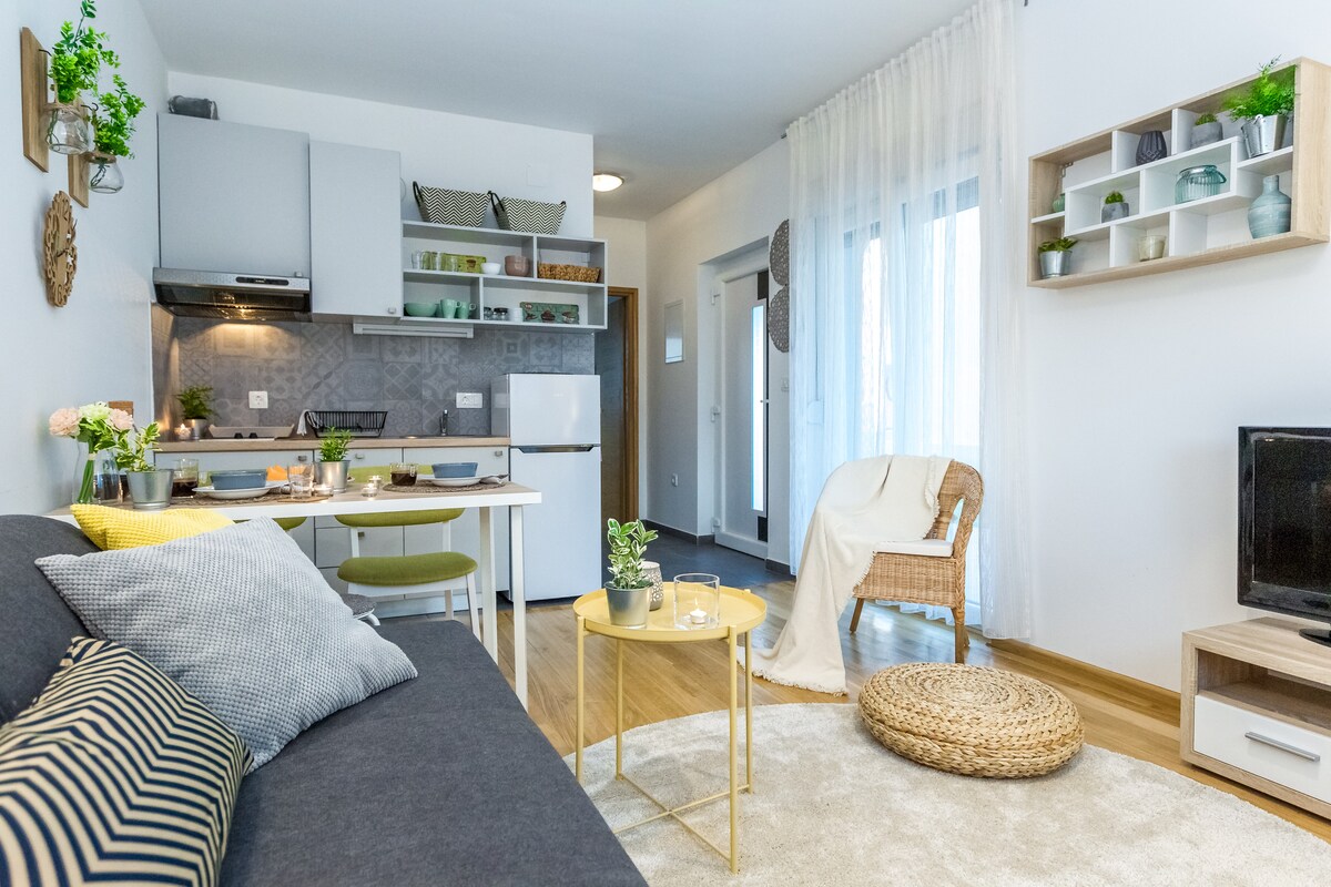 Malinis at modernong apartment na malapit sa sentro ng lungsod ng Zadar sa mas maikli sa 15 -20 minutong lakad, isang grocery store sa tabi mismo nito, na matatagpuan sa isang kapitbahayan na may pribado at maluwang (kahoy na sakop) na terrace at paradahan. Isang silid - tulugan na may komportableng super - king size bed (200 x 180 cm), walk - in shower, high - speed fiber optic WiFi connection, kusinang kumpleto sa kagamitan, radiator heating at A/C system. 5 min lang ang digital nomads coworking station na “Barya”.