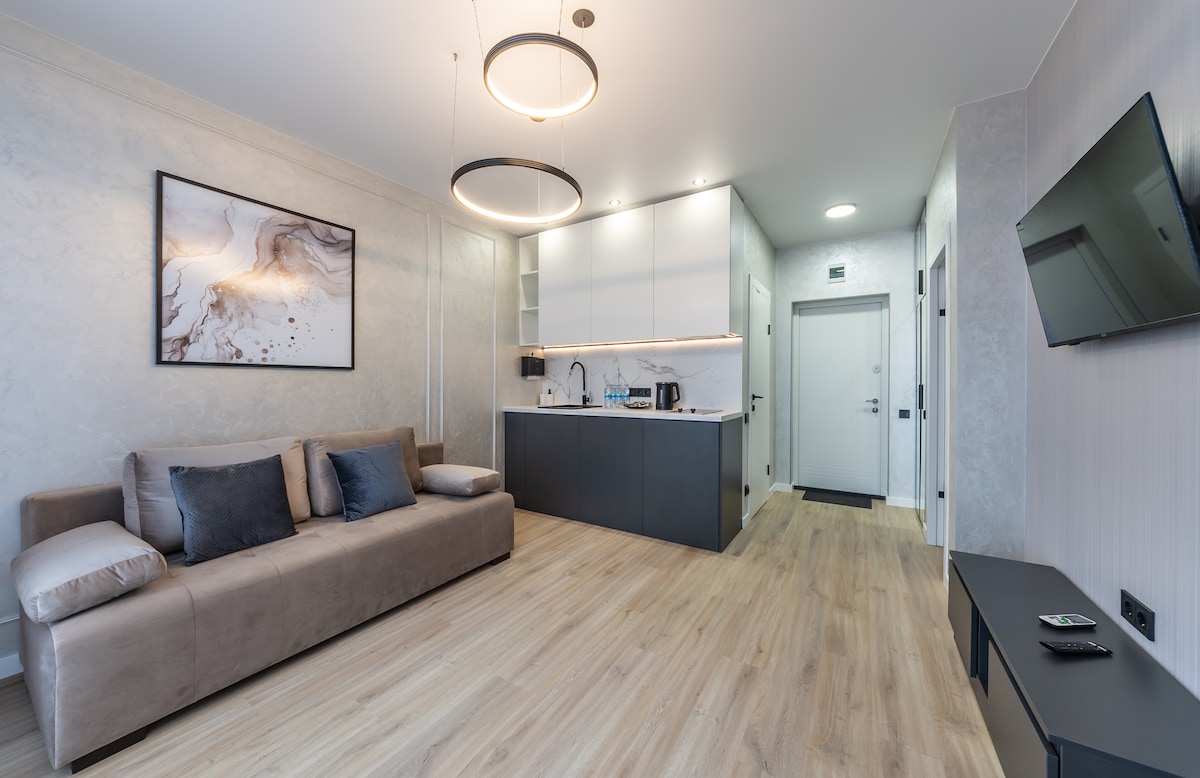 Tuklasin ang minimalist na kapanatagan sa aming designer na apartment na may isang kuwarto sa gitna ng Kyiv. Tuluyan: Queen bed, Smart TV, aircon at high-speed Wi-Fi. Kusina: Kumpleto sa kagamitan at may kape/tsaa. Lokasyon: Bagong gusali malapit sa Universytet Metro at Shevchenko Park. Tahimik, pero ilang hakbang lang ang layo sa mga nangungunang cafe. Mga kagandahan: Pribadong balkonahe, tanawin ng lungsod, at madaling sariling pag‑check in. ✨ Malinis, tahimik, at may perpektong lokasyon. Mag‑book na ngayon ng walang katulad na karanasan sa Japandi!