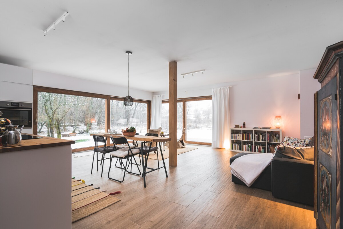 Perfect place for holidays or remote work. Great location for a fantastic getaway. Unique opportunity to explore local wonders and good base for further trips. ***AIR CONDITIONING, HEATING and SUPER FAST INTERNET WI-FI***. This listing offers brand new accommodation in the area of one of the most beautiful National Parks in Poland. Come and explore miles of river, forests, cycling trails, ski slopes, horse riding, castle ruins, local vineyard and much more!