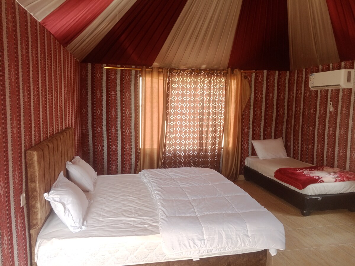 Magdamag sa mararangyang Bedouin Tent sa gitna ng Disyerto ng Wadi Rum Binubuo ang marangyang Tent na ito ng 3 single - sized na higaan sa pribadong kuwarto na may banyo at panoramic window na humahantong sa pribadong terrace na may kamangha - manghang tanawin sa disyerto. Bibigyan ka ng mga tuwalya, shampoo, at libreng tubig. Kasama rito ang almusal sa common room. Ang paglipat mula sa nayon ay 10JD/tao kung hindi ka magbu - book ng tour sa amin.