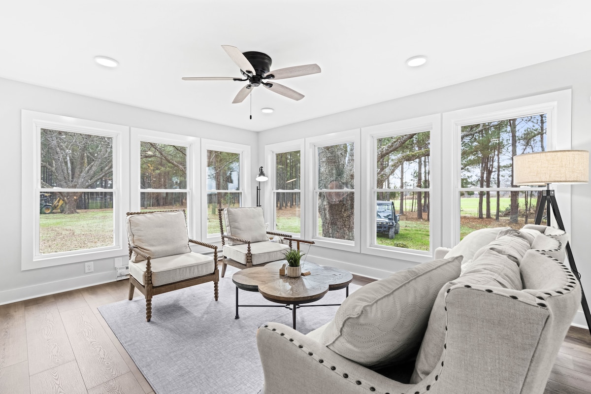 Escape to a fully renovated 120-year-old farmhouse on our fifth-generation working family farm. Nestled 350 feet off the road, it’s surrounded by a 20-acre pine plantation and 10-acre cow pasture. Enjoy modern comforts like Starlink WiFi, a 55" Roku TV, and a fully stocked kitchen alongside charming spaces like a sunroom, rocking-chair porch, and outdoor seating under the pecan tree. Just 6 miles from shopping and dining, this serene retreat offers a perfect blend of farm life and convenience.