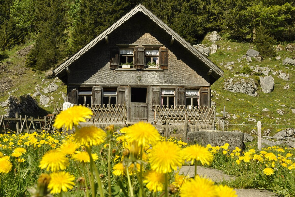 Holiday cottage na matatagpuan sa maaliwalas na slope na may magagandang tanawin. Pagkatapos ng maikli ngunit medyo matarik na paglalakad papunta sa bungalow, masisiyahan ka sa tanawin ng Alpstein kasama ang aming lokal na bundok, ang Säntis, sa isang komportableng terrace. Maraming oportunidad sa paglalakad at pagha - hike mula mismo sa bahay. Pakitandaan: Mula sa paradahan, maaari kang maglakad nang medyo matarik sa burol hanggang sa bungalow na may magandang lokasyon sa gilid ng kagubatan nang humigit - kumulang 100 m.