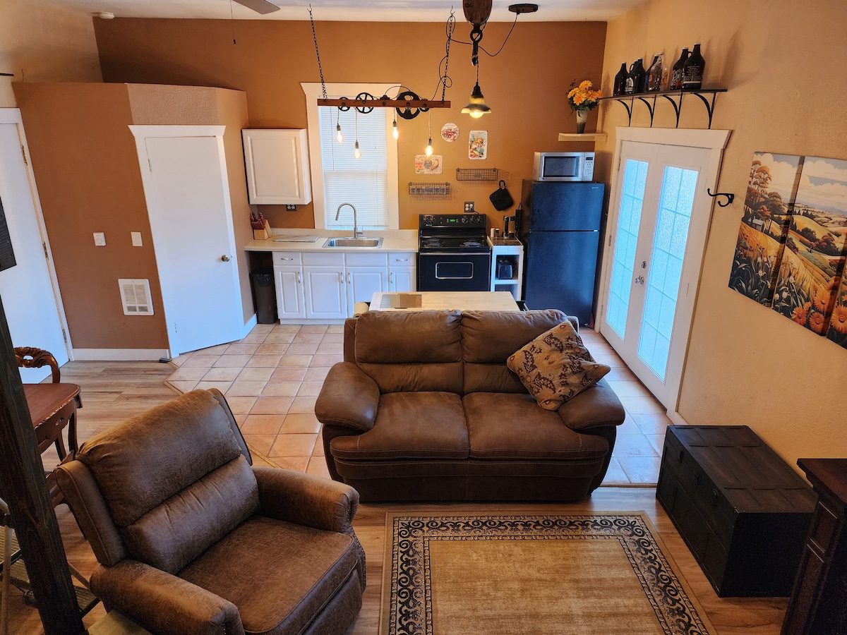 Kick back and relax in this calm, stylish space. Walk into a fully furnished, live-ready, large studio apartment. The private studio has a large open concept with a living room, dining, full kitchen, and bathroom. It has a comfy queen mattress accessed by a full staircase. We are close to town, with a country feel of 1.5 acres. There are country views. and an outdoor kitchen/fireplace. This spot is perfect for a traveling professional that prefers not to share walls with neighbors