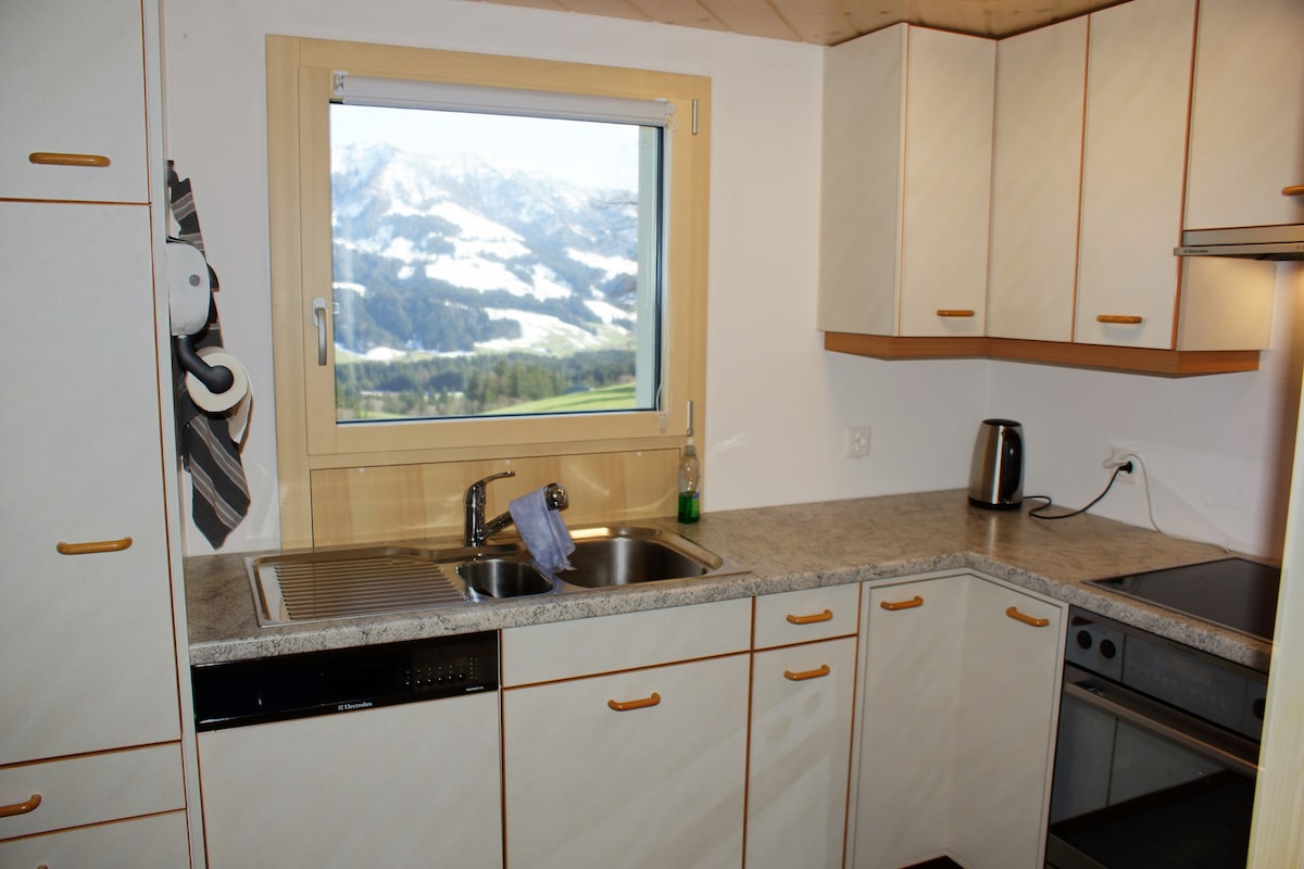 The cosy studio apartment is located in the heart of the Emmental on 1140 m ABS with a view over Eiger, Mönch and Jungfrau. The farmhouse from the year 1850 which was renovated in 2019 lies in a quiet neighbourhoor above the sea of fog. The flat has a seperate entrance and a sheltered terrasse with a view over the Alps. The terrasse, which is alined to the south is shared.