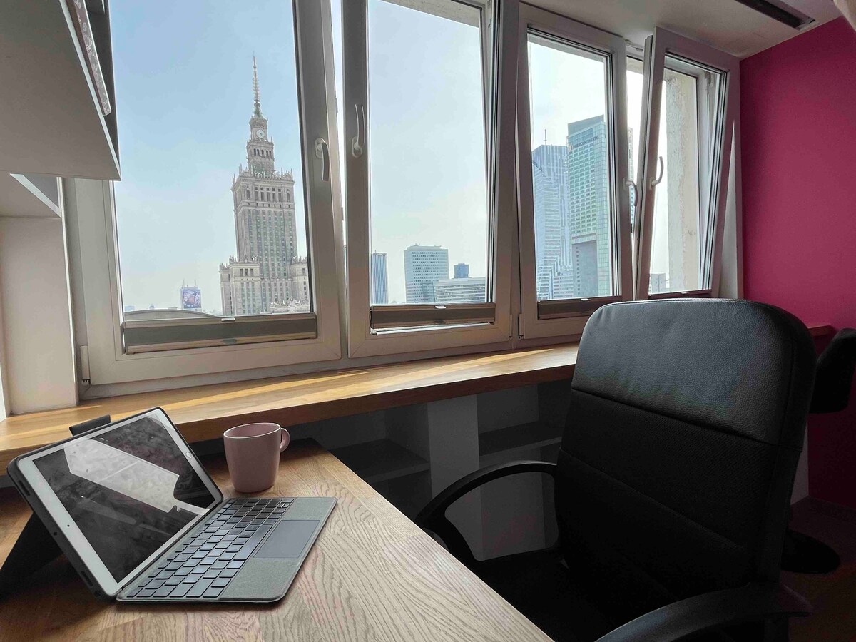 Ang komportableng apartment sa gitna mismo ng Warsaw ay matatagpuan sa isang tenement house sa Aleje Jerozolimskie 83 kung saan matatanaw ang Palasyo ng Kultura at Agham (magandang tanawin ng mismong sentro ng Warsaw SA GABI:) Matatagpuan ang Visa at vi Central Station. Pagpasok sa escalator diretso sa pasukan ng gusali! Sa lugar din: Underground Shopping Passage na may maraming boutique at restawran nito pagkatapos ay ang Golden Terraces Shopping Center at ang sikat na Hard Rock Caffe. May komportableng continental bed at kitchenette ang apartment.