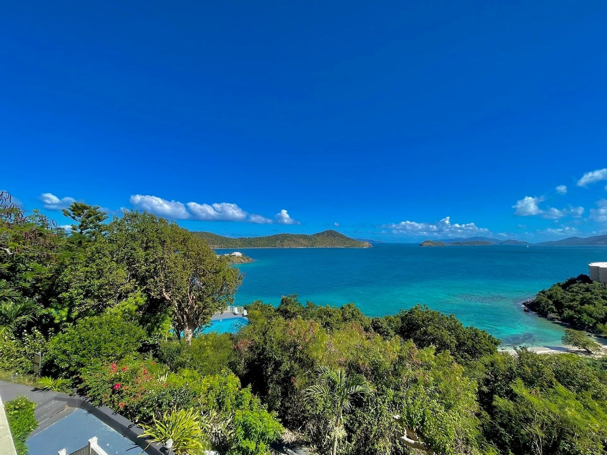 Maluwang at marangyang apartment na may 2 kuwarto at 2 banyo sa Fish Bay Skytop na may kumpletong kusina at washer/dryer. May mga memory foam mattress ng Loom & Leaf ang parehong kuwarto. Kuwartong may king-size na higaan at en-suite na banyo, pangalawang kuwartong may queen-size na higaan at banyo sa kabilang dako ng pasilyo. Smart TV na may Netflix at mga streaming app (walang cable). 10 minutong biyahe papunta sa mga kainan, shopping, at grocery sa Cruz Bay at 25 minutong biyahe papunta sa mga beach sa North Shore. 4 na talampakang shared pool at BBQ na may dalawa pang apartment.