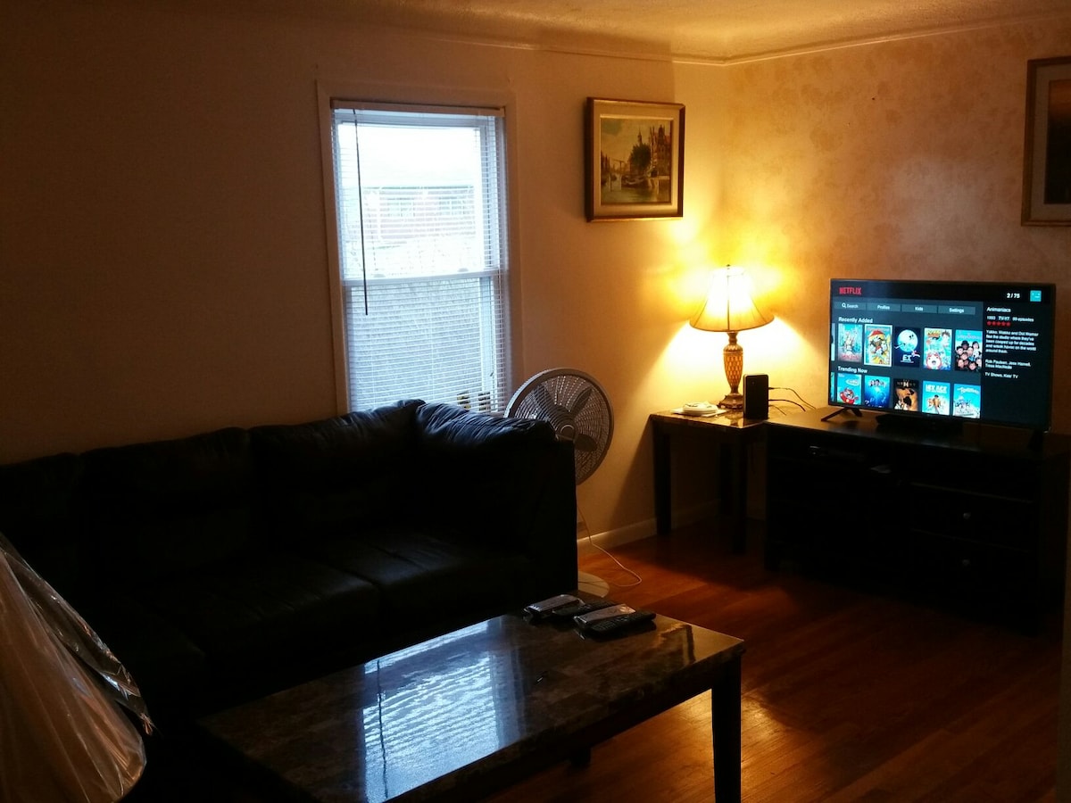 Ito ay isang pribadong guest suite (BUONG mas mababang antas ng walkout - tinatayang 1,750 sq ft) sa loob ng aming mas malaking 3 - palapag na bahay na inookupahan. Isang komportableng tuluyan na may 2 silid - tulugan, 1 buong paliguan, sala, at kusina na may full - frig, dishwasher, coffee maker, electric range, toaster oven, microwave, at counter na may 6 na upuan. Mga bagong kutson, sapin sa kama, unan, at tuwalya. Puwedeng gumamit ang mga bisita ng back patio area na may natural na fire pit, na natatakpan ng pavilion na may gas fire feature, grill, at hot tub. Mahusay na Wifi at Smart TV.