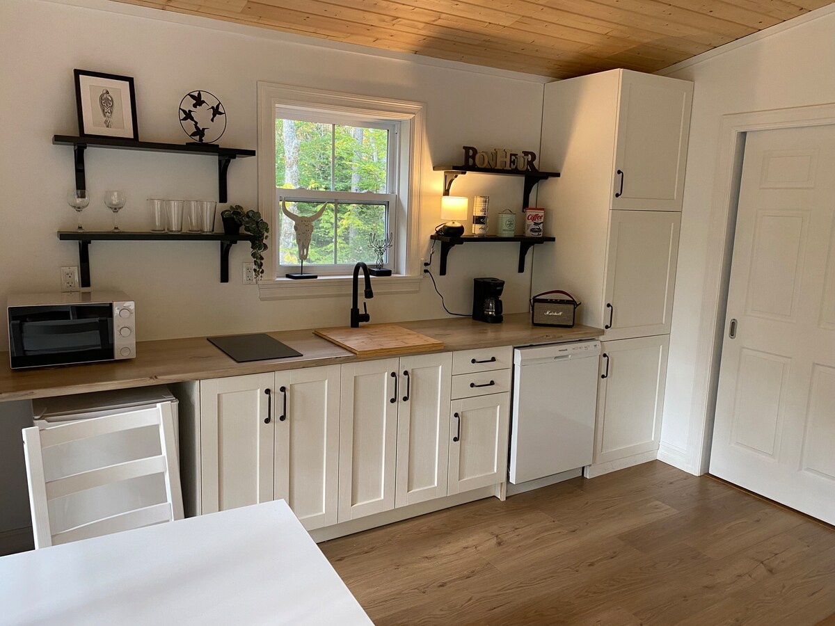 Small private lakefront cottage. Secluded property next to the beautiful Ellenwood Provincial Park, full of hiking/walking trails. Rustic, and undergoing minor renovations, but a very cozy, clean place to stay. The Lake is clean and great for swimming! Full kitchen with most everything, an outdoor fire pit for nice nights, and a piano for rainy days. Heat pump, BBQ, fibre op, & Roku TV + Netflix! Wood stove is functional for extra heat and ambiance, wood not included however.