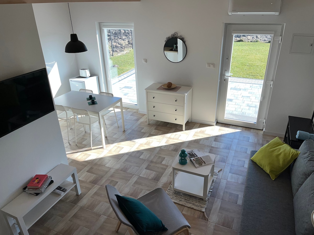Holiday cottage para sa upa sa tabi ng dagat na may isang apat na tao na silid - tulugan sa attic (dalawang single bed at isang double bed). Sa unang palapag ay may banyo at sala na may kusinang kumpleto sa kagamitan (refrigerator, induction hob, microwave, coffee maker, kaldero, washing machine, pinggan at kubyertos). May sofa bed, wood - burning fireplace, at TV ang sala.
