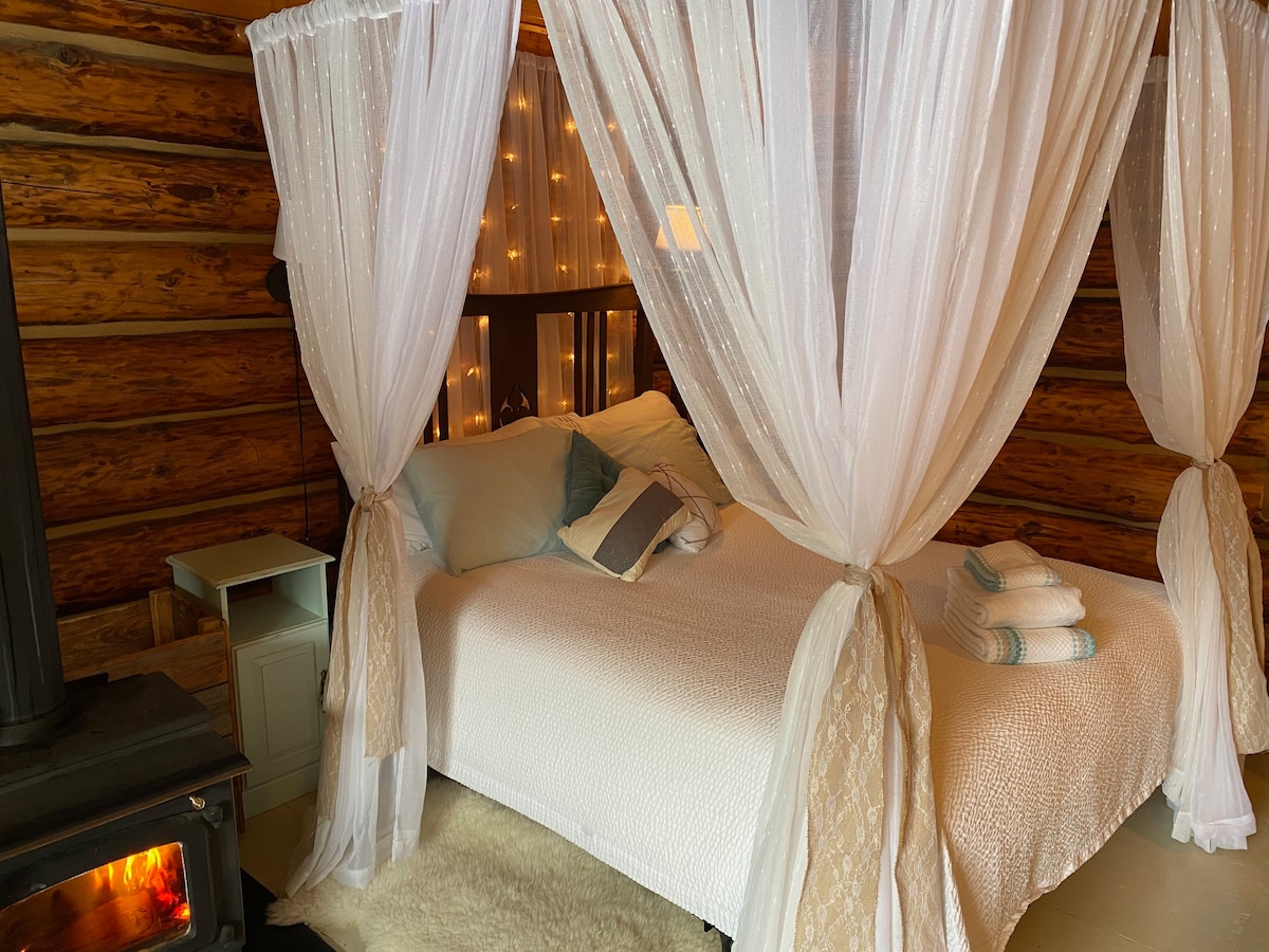 Ang napakarilag at maluwang na cabin na ito ay may 4 na tao na may 1 queen sized bed at 2 single bed. (maaari itong matulog hanggang 6 na may 2 sofa bed). Sa gitna ng cabin ay may magandang kalan na gawa sa kahoy, kaya sa maginaw na gabing iyon, puwede kang mag - snuggle sa tabi ng apoy at mag - toasty. Mayroon itong 2 silid - tulugan, 1 banyo, kusina na kumpleto sa kagamitan, silid - kainan, sala, wireless Internet, Bluetooth speaker, at pribadong deck na may mga upuan, mesa para sa piknik, at barbecue.