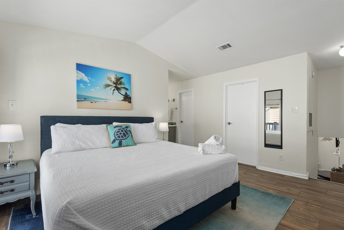 Makaranas ng tunay na hospitalidad sa English‑style na cottage ko sa tabi ng dagat. Mukhang komportableng suite sa magarang hotel ang tuluyan. Sa loob, magkakaroon ka ng komportableng pakiramdam ng cottage, king size na higaan na may mararangyang linen, kumpletong gamit na kitchenette at kakaibang dining area, at tub at shower combo sa banyo. Magpalamig sa simoy ng hangin mula sa gilid ng dagat sa pribadong patyo. Espesyalista kami sa pagbibigay ng pribadong tuluyan para makagawa ka ng magagandang alaala. Ilang minuto lang ang layo sa beach 🏖️ at sa lahat ng kagandahan ng Galveston.