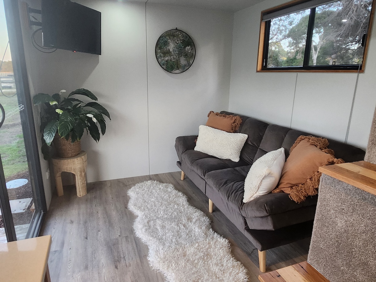 Welcome to "Marli Vibes". A lovingly owner built, eco friendly, off grid, authentic Tiny Home on wheels. "Marli Vibes" is dog and horse friendly, the ultimate destination for you and your fur or hair babies. We have direct access to the beach for riding or walking. MV has every comfort possible in a tiny home. Diesel heating LPG gas cooking and BBQ Indoor and outdoor hot showers Full size fridge Huge servery window Fire pit Note The stairs are steep not suitable for everyone Septic system