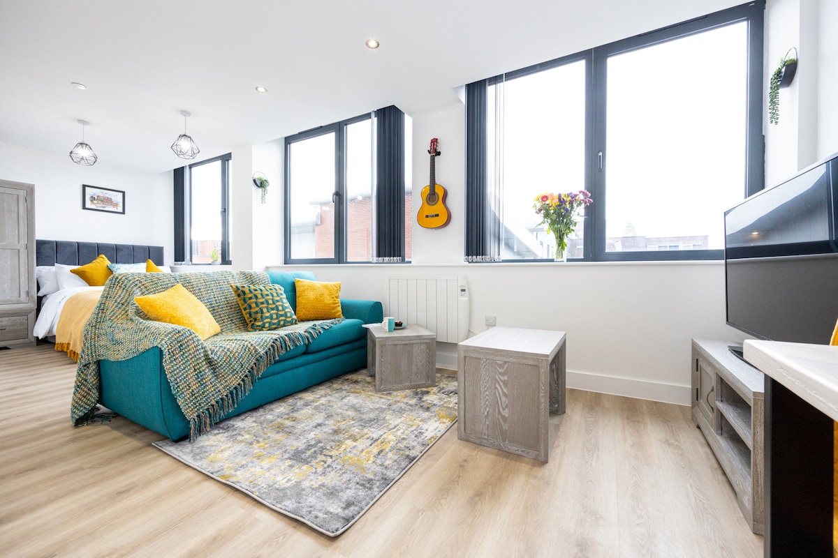 Isang bagong Luxurious 1 Bed Apartment na may Sofa Bed na may mga premium na muwebles na oak. Maliwanag, Maluwag, at Komportable nito Matatagpuan sa tapat ng Emirates Old Trafford at 5 minutong lakad lang papunta sa maalamat na Manchester United Stadium, nag - aalok ito ng pangunahing lokasyon. Bukod pa rito, may maikling 5 minutong lakad na magdadala sa iyo papunta sa tram stop, na nagbibigay ng direktang access sa mataong City Center. Tuklasin ang perpektong timpla ng kasaysayan, isports, at libangan sa panahon ng iyong pamamalagi