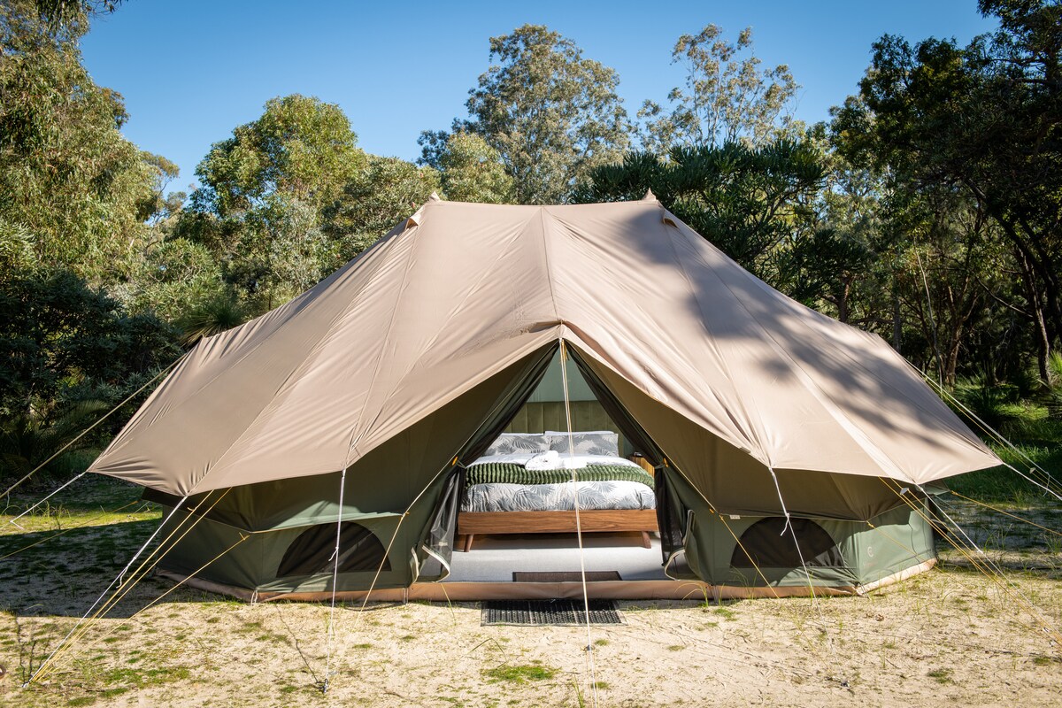 Nasa iyo ang mararangyang bush bath, campfire, at malaking pribadong kampanilya sa talagang di - malilimutang bakasyunan sa bukid na ito sa gitna ng bansa ng alak sa Margaret River. Magrelaks sa iyong komportableng, marangyang itinalagang 6m tent (na may kuryente), pribadong shower sa labas, maliit na kusina, wildlife at mga trail. Mga linen ng designer, queen bed at komportableng Zeek hybrid mattress, electric blanket, Bluetooth speaker, kitchenette, library, artisan na gumagawa ng mga opsyon - kahit na mga woolly na medyas! Nagsusumikap kaming lumampas sa iyong pinakamataas na inaasahan sa kaginhawaan.