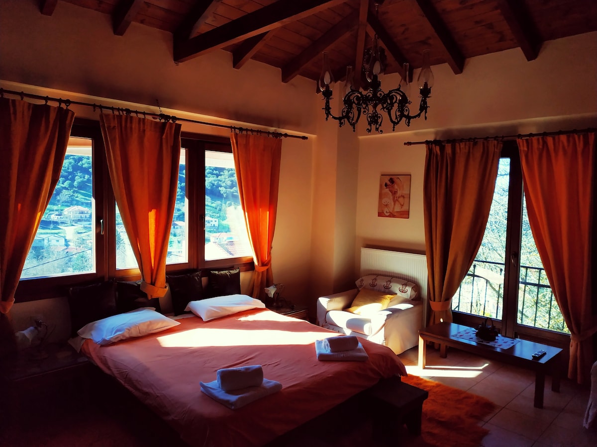 Isang kuwartong studio na 35sq.m. na may double bed. Tanawin mula sa Bundok Velia hanggang sa Erymanthos at sa lungsod ng Kalavryta. Access sa 3rd floor sa pamamagitan ng panlabas na hagdan ng bato. Autonomous heating, stone fireplace, mini refrigerator at de - kuryenteng kalan para sa mga inumin. May malinaw na kahoy na kisame ang attic. Wala itong balkonahe pero may mga pinaghahatiang balkonahe at patyo. Ibinibigay ang kahoy para sa fireplace kapag hiniling. Hindi pinapahintulutan ang pagluluto sa fireplace.