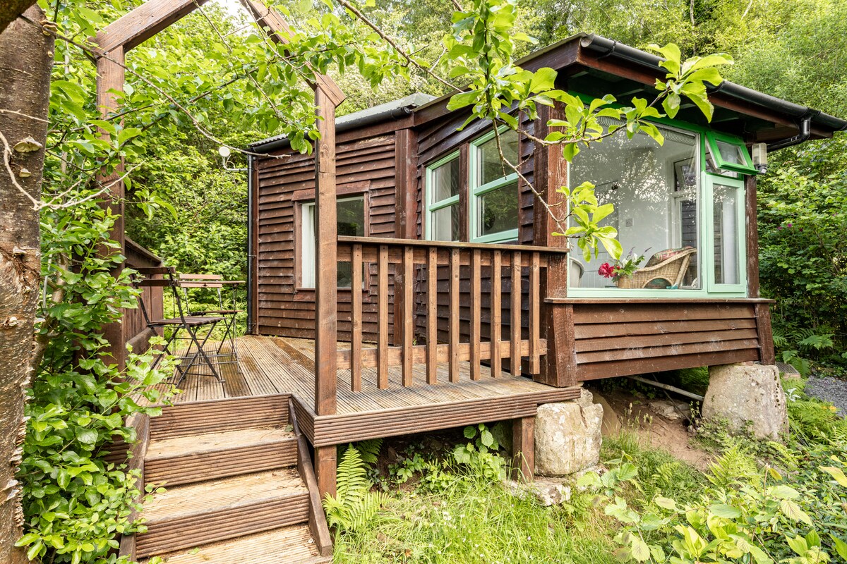 This cabin has a hexagon shape with a square porch where the front door is. The Hexagon, as I call it, is situated on its own on land that is half orchard half woodland. On the morning sun side, where the door is, the decking leads to the little purpose built bathroom building. There is a perspex canopy so you can walk over staying dry even if it is raining. A few goats and a few hens roam in the adjoining field.