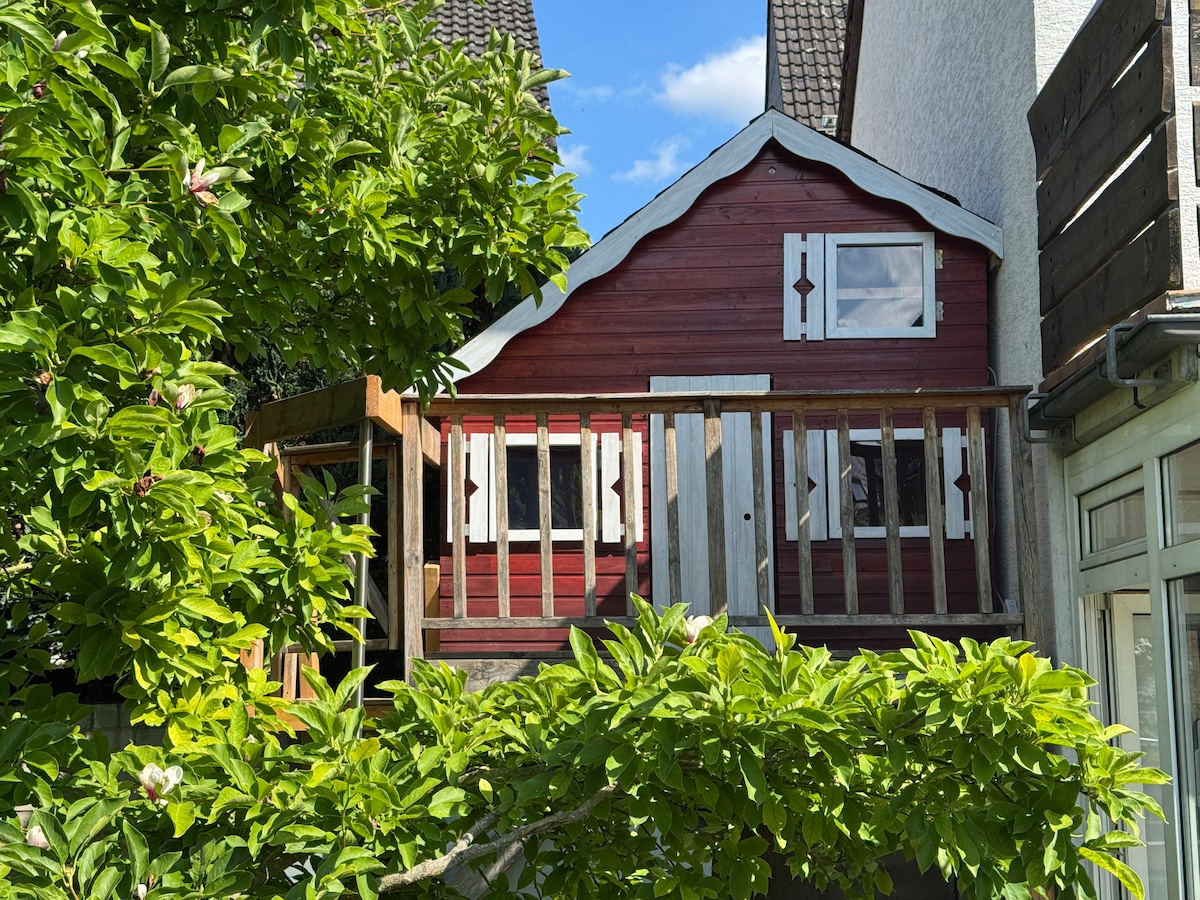 Mamalagi sa hardin sa kanayunan na may mga tanawin sa mga bukid ng skyline ng Frankfurt. Nag - aalok ang cottage ng maliit na kusina na may kalan at refrigerator, banyong may shower, lababo at toilet. Inaanyayahan ka ng komportableng hapag - kainan, maliit na sofa, at terrace na magtagal. Umakyat ang hagdan sa itaas na palapag na may higaan (2 kutson at 80 cm ang lapad) at aparador. Susunod ang mga litrato mula roon sa sandaling na - clear ng aking anak na babae ang kuwarto.