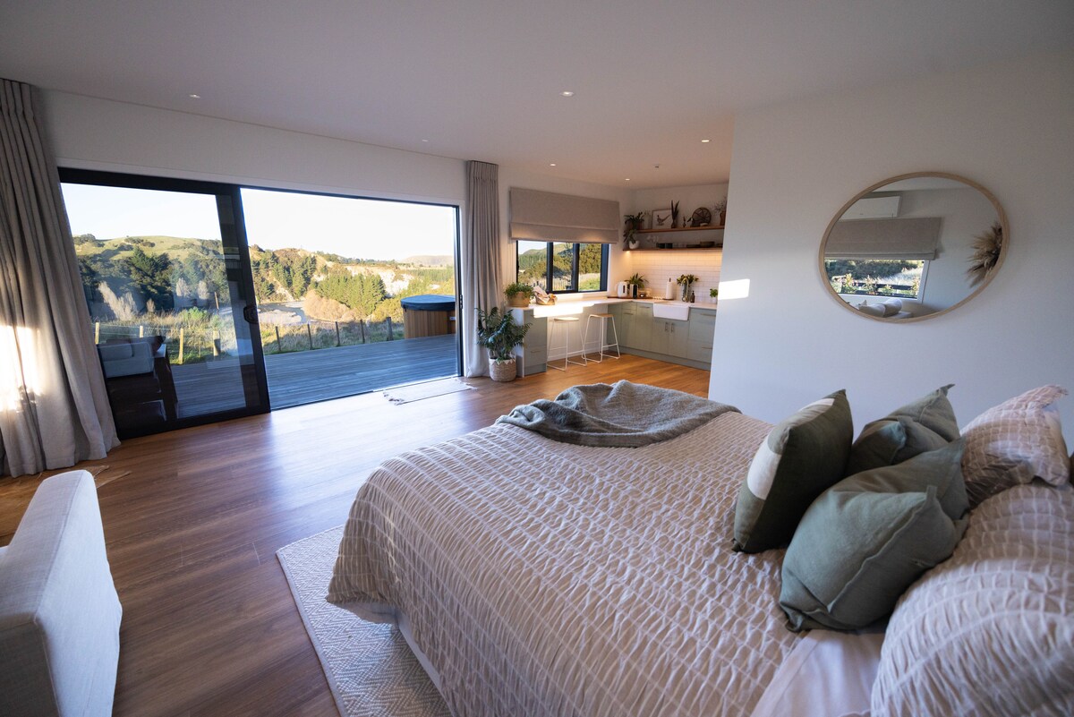 Ang bagong guest house na ito ay itinayo at naka - istilong may kaginhawaan sa isip. Nakaposisyon ito sa isang tahimik at rural na lugar kung saan matatanaw ang nayon ng Bay View, 10 minutong biyahe mula sa lungsod ng Napier. Ipinagmamalaki ng bawat bintana ang nakakamanghang tanawin ng dagat o kanayunan.