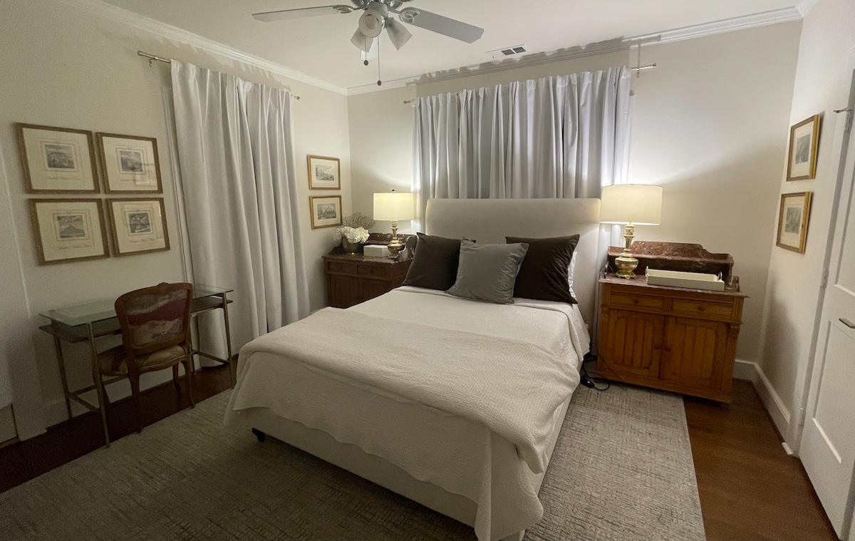 Pribado, komportable, cute na 450 talampakang kuwadrado na studio na may maraming queen bed, queen sleeper - sofa, kitchenette na may kumpletong kagamitan (single burner hot plate at mini fridge), lounge area, dining area/workspace, at hiwalay na hardin na may mesang piknik. Mayroon itong kumpletong banyo na may aparador na nilagyan ng maraming hanger. Ito ay isang perpektong home - base para sa pagtamasa ng isang magandang kapitbahayan na naka - highlight ng White Rock Lake, The Dallas Arboretum, at madaling access sa Downtown, Uptown, at Deep Ellum.