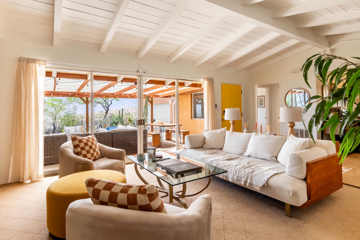 Ang Mockingbird Cabin ay isang kanlungan ng mahilig sa kalikasan na nakatayo sa gilid ng burol sa 2.5 pribadong ektarya. Ang ganap na na - renovate, puno ng liwanag, midcentury na hiyas na ito ay may mataas na vaulted ceilings, isang filter na sistema ng tubig, kusina ng chef, natitiklop na mga pinto ng salamin na bukas sa isang birdwatching + yoga patio at isang hot tub para sa stargazing. Matatagpuan malapit lang sa Big Morongo Canyon Preserve, nag - aalok ang mapangaraping hideaway na ito ng front row seat sa 200+ species ng mga lumilipat na ibon at mga kuneho, squirrel at butterflies.