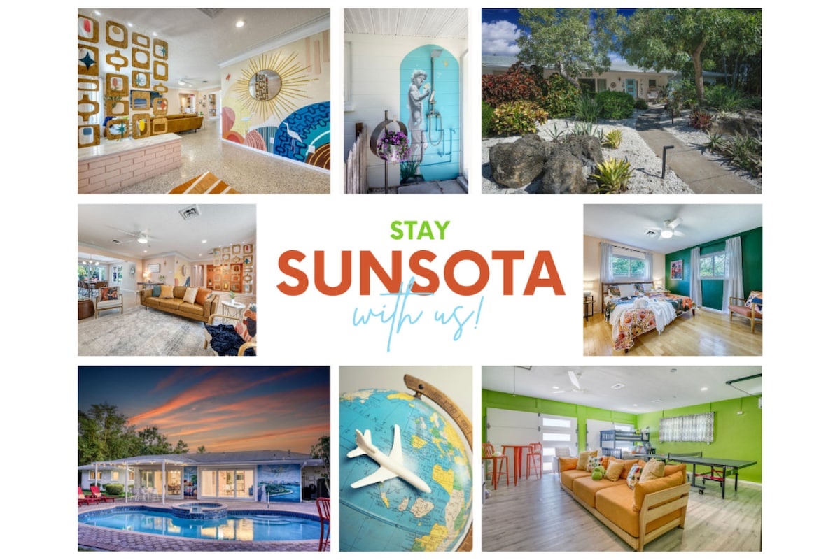 Maligayang pagdating sa Coastal Farmhouse Sarasota! ✨ Dalawang bloke lang ang iyong perpektong bakasyunan ng pamilya mula sa Sarasota Bay at ilang minuto mula sa mga pinakasikat na beach sa Florida na Siesta Key, Lido Key, Bradenton Beach, at Anna Maria Island. Idinisenyo nang isinasaalang - alang ang mga pamilya at grupo, ang bagong inayos na tuluyan na may 4 na silid - tulugan na ito ay may hanggang 12 bisita at nagtatampok ng naka - screen na heated pool, kumpletong kusina, at maliwanag at bukas na layout na perpekto para sa pagrerelaks at nakakaaliw. Perpekto para sa mga pamilya, grupo, at mahilig sa beach!