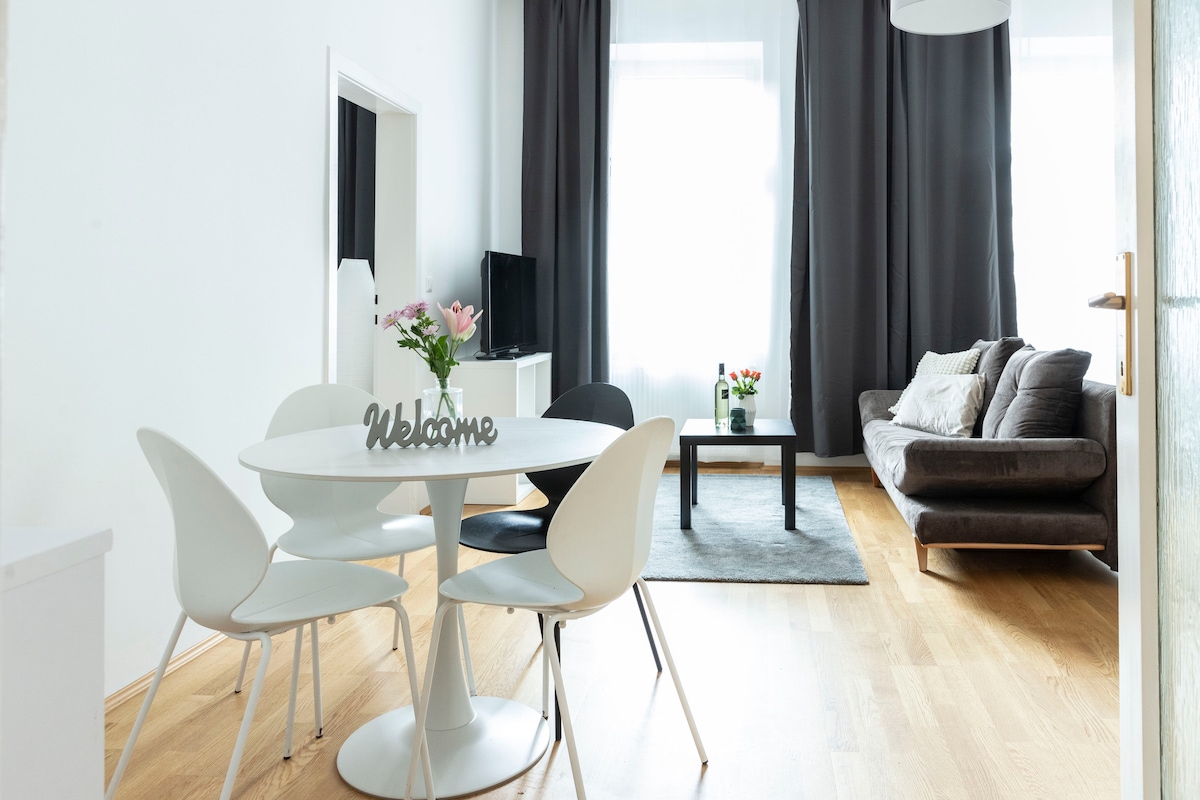 Bagong na - renovate na naka - istilong apartment na matatagpuan sa French District ng Vienna, napaka - sentro, 2 minutong lakad ang layo mula sa pampublikong transportasyon at 7 minutong biyahe papunta sa sentro ng lungsod. Maaliwalas at mapayapa ang patag na 2 kuwarto, na angkop para sa mga turista o business traveler. Mayroon itong hiwalay na kuwarto na may double bed, malaking built - in na aparador at sala na may komportableng sofa bed. Ang kusina ay mahusay na nilagyan ng mga machine ng Siemens kabilang ang kettle, Nespresso at iba pang mga machine. Maluwag ang mararangyang banyo na may designer na paliguan.