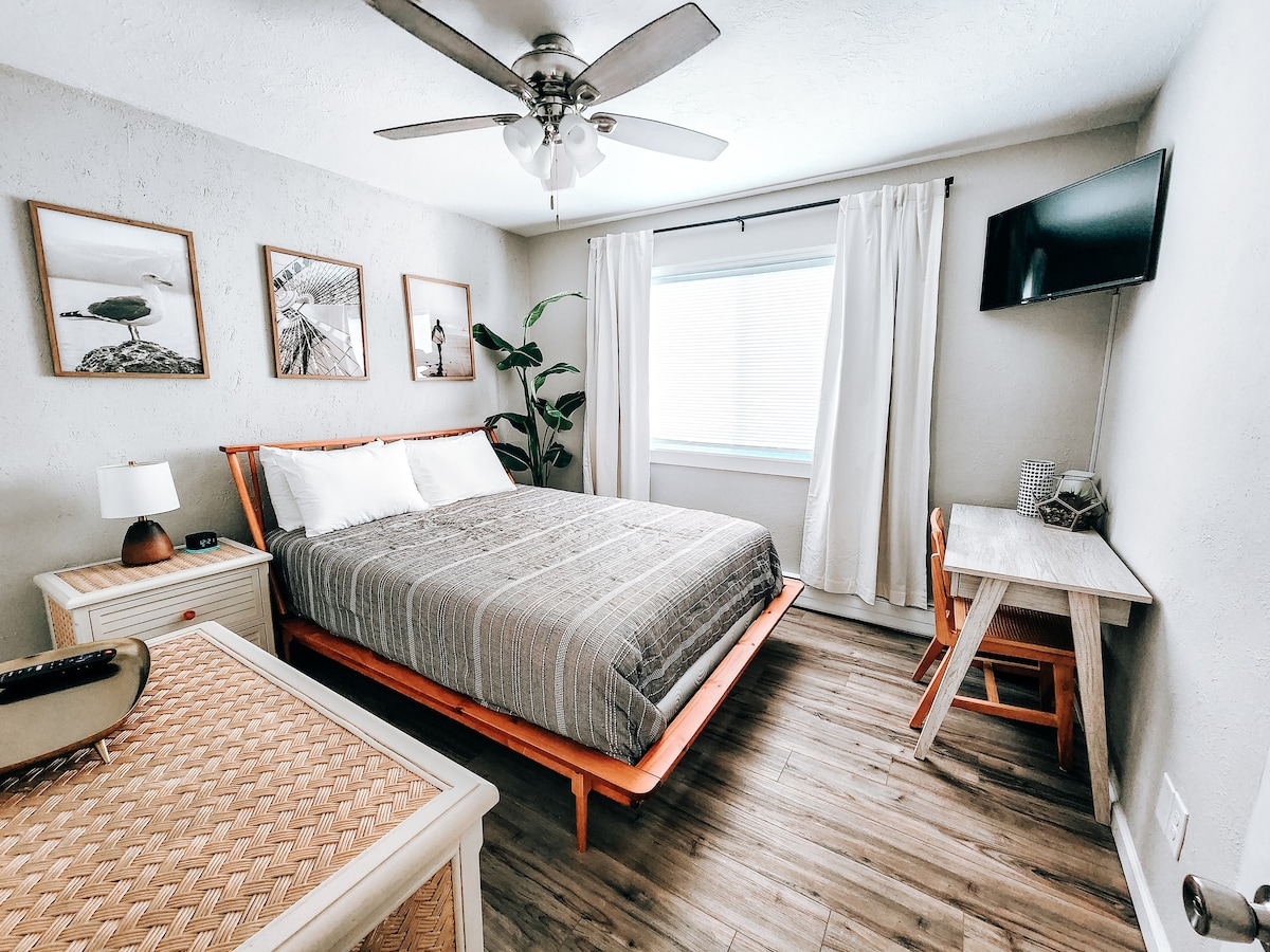 Itong magandang 2 BR, 1 bath ay itinayo para sa pahinga, pagpapahinga at pag-recharge sa baybayin! Isang palapag, 3 hakbang para makapasok, maliit na bakuran na may gas grill at hapag‑kainan. 3 bloke lang silangan ng mga LIBRENG beach at 2 bloke kanluran ng bay. Walang ihahandang mga kobre‑kama (queen) at tuwalya. May mga unan, comforter, at kumot. Kailangang 25 taong gulang pataas ang mga bisita para makapag‑book AT makapamalagi sa lugar. Maaaring hilingin ng host ang pagbeberipika ng ID ng mga bisita para kumpirmahin ang edad.