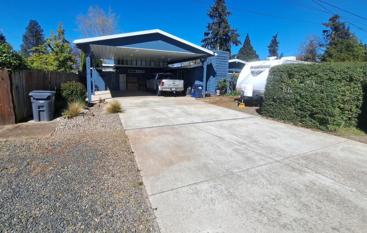 *Super Clean and Comfortable living space with many extra perks. *Fully stocked Kitchen *Sleep well on 14" Memory Foam Queen Bed and Pillows *Enjoy streaming your favorite shows on our upgraded Smart TV and sound bar, or watching supplied DVD's *Only about 12 minutes to Autzen Stadium and about 5-7 minutes from down town. *Close to the local airport, but not in the fly zone. *Only about 1hr to the Oregon Coast. *Easily sleeps and accommodates 2 adults. *Nicer than most hotels, plus more private