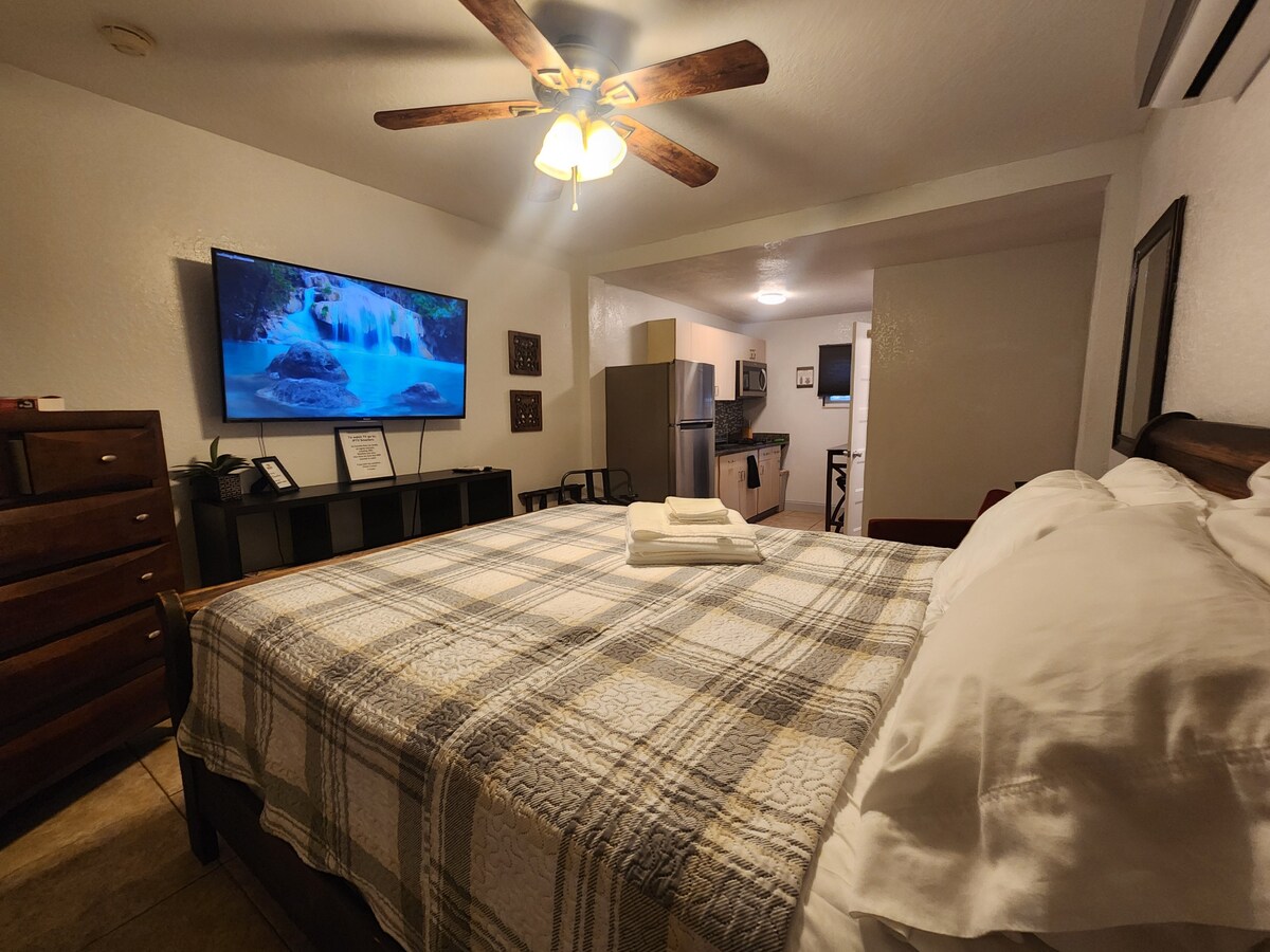 Ganap na pribado, bagong ayos na studio guesthouse na may pribadong backyard oasis na nagtatampok ng kamangha - manghang gas fire pit at outdoor grill na matatagpuan sa isang tahimik na kapitbahayan sa central Orlando! Malaking kuwartong may komportableng queen - sized na higaan, smart TV, dalawang accent chair, sulok sa kusina, a/c, refrigerator, double cast iron burner, WiFi, coffee maker, toaster at buong banyo. Hablamos Español