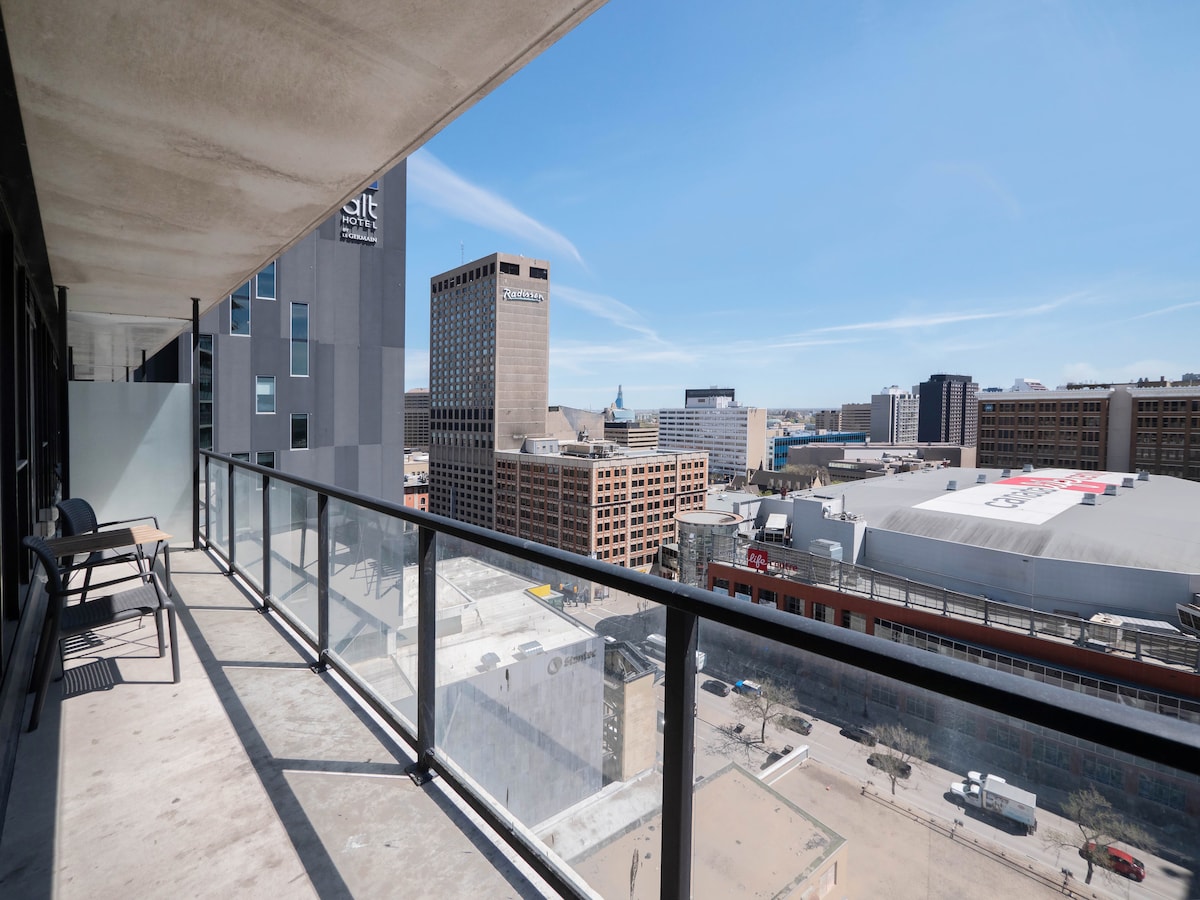 Maligayang pagdating sa nakamamanghang 2 - bedroom, 1 - bathroom high - rise condo na may mga bintanang salamin mula sahig hanggang kisame. Matatagpuan sa ika -16 na palapag, nag - aalok ito ng pinakamagandang tanawin sa gusali! Ang malawak na 20 talampakang balkonahe, ang pinakamalaki sa gusali, ay nagbibigay ng mga nakamamanghang tanawin ng nakapaligid na lugar, kabilang ang Canadian Museum for Human Rights, kaakit - akit na paglubog ng araw ng prairie, at magagandang tanawin ng True North Square.