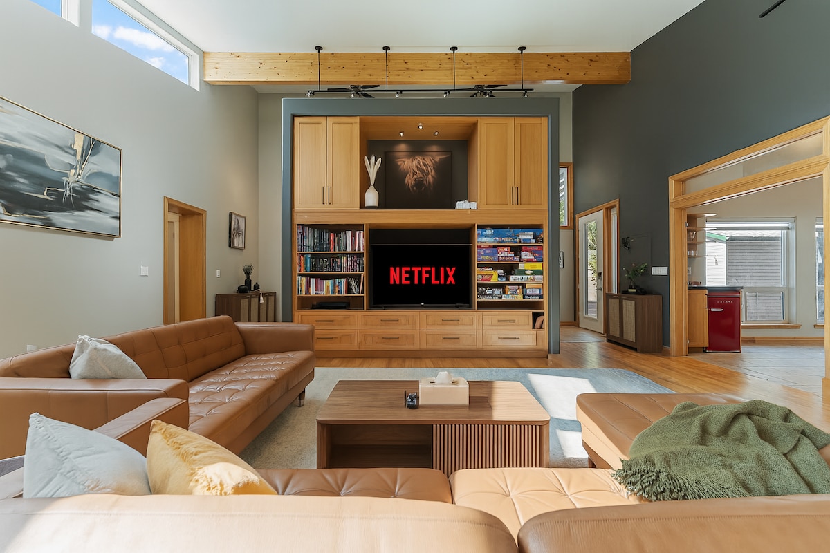 Riverfront retreat minutes from downtown! Unwind in the hot tub, gather by the fire pit, or stroll straight into Bois-des-Esprits forest. Inside: 4 spacious bedrooms, 2 baths, grand living room, game lounge with pool table, ping-pong, arcade, gym & smart TVs. Huge kitchen and dining for family feasts. Kayaks, riverside sunsets, walks on a frozen river and year-round adventure await—relax or explore, then book now to secure your dates!