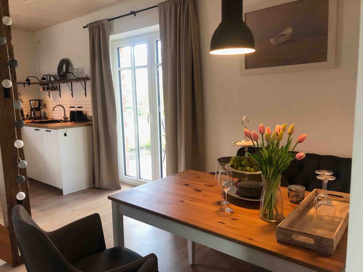 Urlaub an - Alltag aus! Frisch sanierte Wohnung am Deich mit Weitblick über die Felder und Wiesen. Eingerichtet mit Einzelstücken und Dingen die Freude machen. Terrasse in Richtung leuchtendem Abendhimmel, daher kein TV. Tolles Bad und PiPaPo … siehe Fotos. Hören sie die Möwen schreien, die Schafe blöken und lassen sie sich den Wind um die Nase wehen. Jede Wohnung hat ihren eigenen Naturgarten. Idealer Ort für entspannte Paarurlaube, um dem Stadttrubel zu entfliehen.