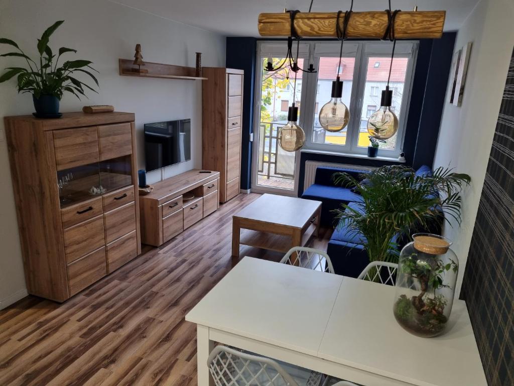 Miejsce jest komfortowe i nowoczesne. Mieszkanie posiada osobną sypialnię z szafą, oraz salon z TV i stołem z 4 krzesłami. Narożnik jest rozkładany i służy jako dodatkowe miejsce do spania. Komfortowe stół i krzesła mogą służyć jako jadalnia lub miejsce pracy. Kuchnia posiada zmywarkę, lodówkę, kuchnię gazową i czajnik elektryczny. Łazienka wyposażona w wannę, która może służyć jako prysznic. Idealne dla rodziny i podróży służbowych. W mieszkaniu jest pralka i odkurzacz.