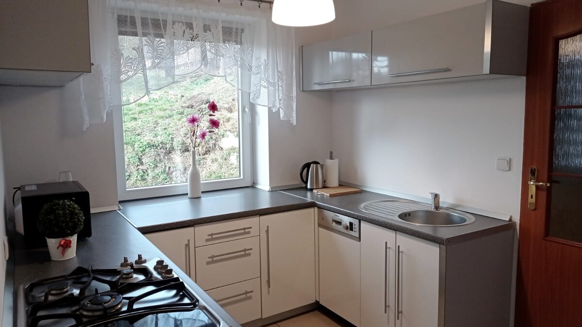 A separate flat in a private (my wife and I live here) house on the ground floor, with a separate entrance, 7 km from the centre of Rybnik, in a quiet green area, with an exit to a balcony and a nice view. You will have the whole rented place to yourself and you will stay there only with the people you travel with. Amenities: - flat with separate bathroom and washing machine for guests only - Free parking on a closed property - free wi-fi, tv