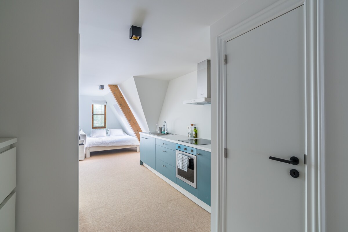 Studio sa isang tahimik na kalye sa attic ng munting kastilyo kung saan kami nakatira. 5 minutong lakad papunta sa transportasyon na nag‑aalok ng direktang access sa sentro ng lungsod (35–40 min). May kasamang double bed para sa 2 bisita at sofa bed para sa hanggang 4 na bisita. (Toilet at hiwalay na banyo) Kung gusto mong buksan ang sofa, maglagay ng 3 tao sa reserbasyon ⚠️nasa ika-3 palapag ito at walang elevator. Libreng paradahan 5 min na lakad mula sa bahay. ⚠️ hindi pinapayagan ang mga bisita sa gabi
