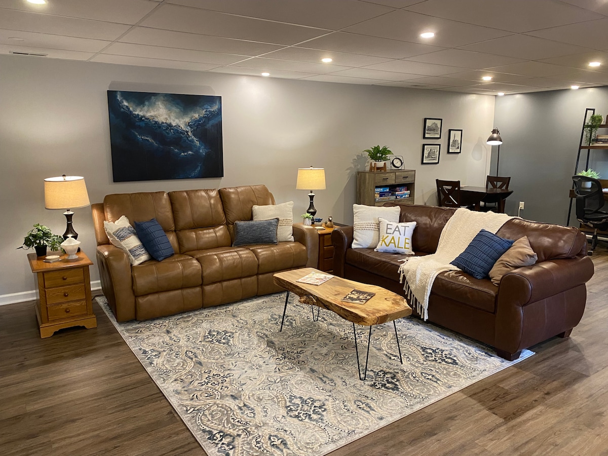 Matatagpuan sa isang maganda at pribadong lugar ng bansa sa 7 ektarya. Kasama sa mga akomodasyon ang natapos na basement unit na may pribadong pasukan, 1,400 talampakang kuwadrado para makapag - unat gamit ang kumpletong kusina, family room na may mga komportableng leather couch, flat screen TV, at office area na may working desk at mga upuan. Walk - in na labahan na may full - sized na washer at dryer. Master bedroom na may king bed at pribadong half - bath, 2nd bedroom na may queen bed. Pinaghahatiang buong paliguan sa pasilyo. Sa itaas ng bahay na tinitirhan ng mga may - ari