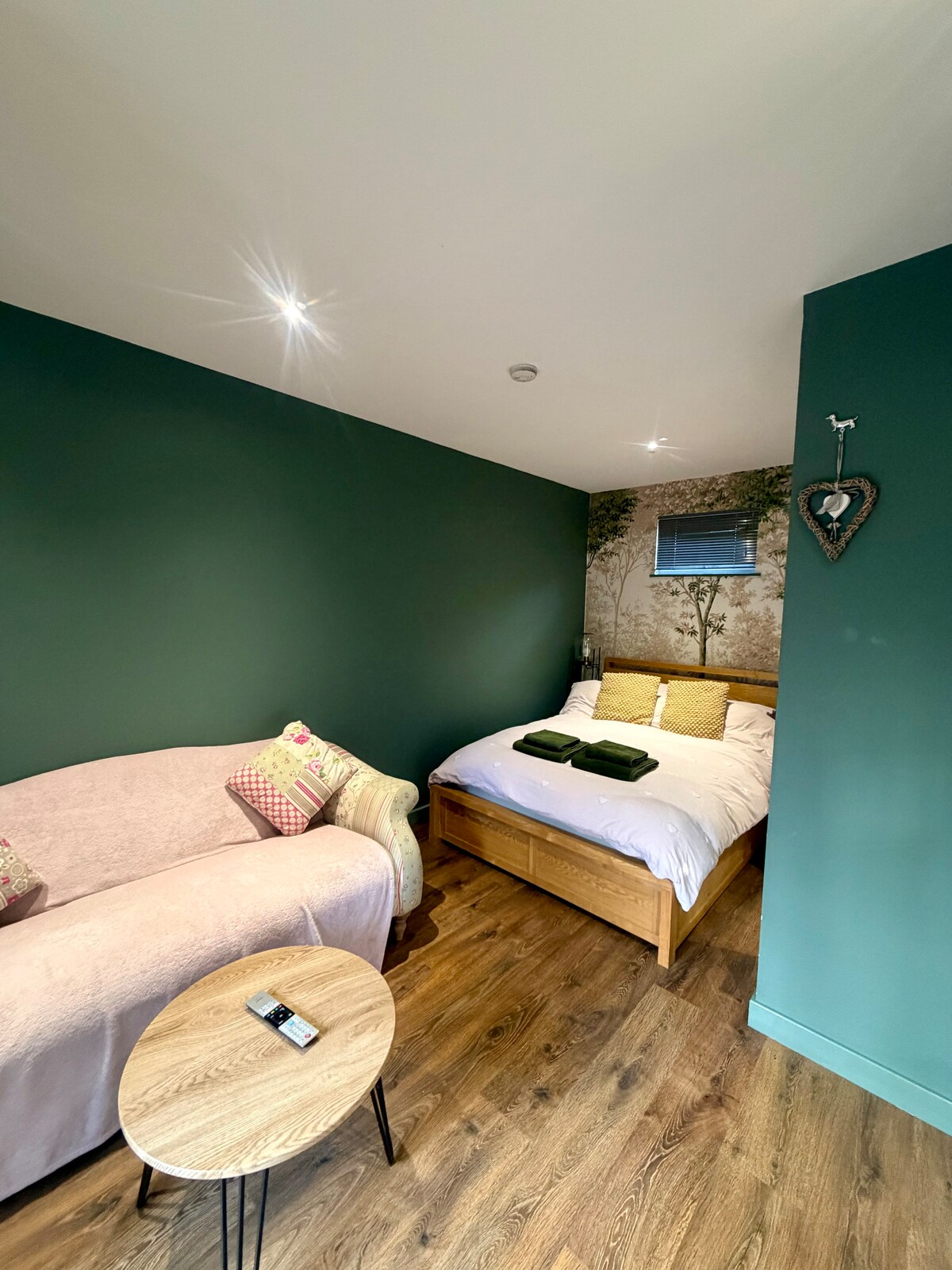 A modern self-contained annexe apartment with a private entrance leading to a good sized kitchenette and sitting area, with table, chairs and TV. The large private bathroom has a full size bath and separate shower, whilst the bedroom has a king sized bed, wardrobe and tv, There is hi speed wifi throughout. Outside there's a screened patio area for guests with picnic table, room for bike storage and a parking space (there also an electric vehicle charging point for use by arrangement).