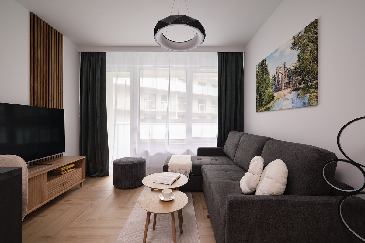 Apartament dla pary, grupy lub rodziny na nowoczesnym osiedlu: ✔ Dwie sypialnie ✔ Rozkładana, dwuosobowa sofa w pokoju dziennym (szerokość spania 140 cm) ✔ W pełni wyposażona kuchnia - zmywarka, płyta indukcyjna, piekarnik, lodówka, mikrofalówka ✔ TV, Internet Wi-Fi ✔ Osiedle monitorowane kamerami zewnętrznymi i ochrona zapewniająca bezpieczeństwo Place zabaw i mini siłownie na zewnątrz.